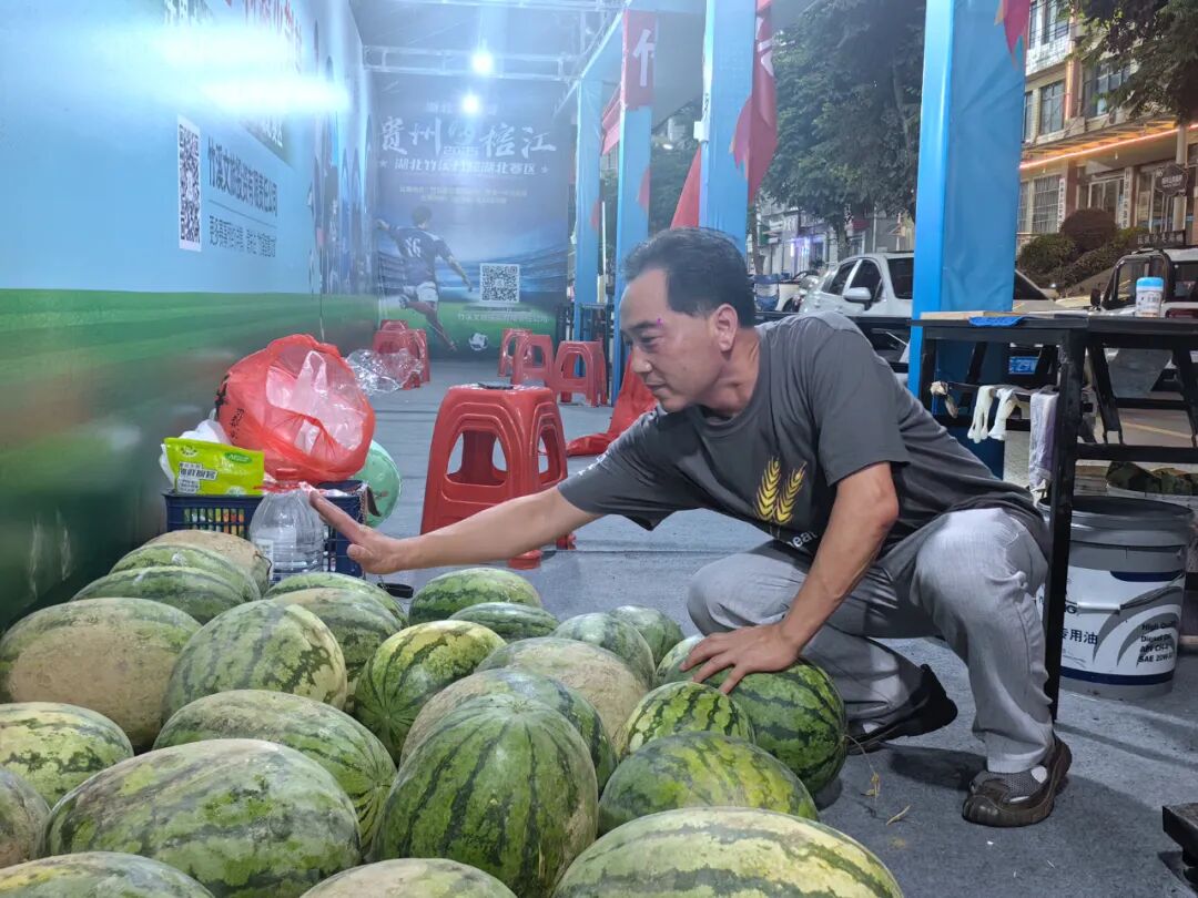 新洲西瓜既是消暑的佳品,也是竹溪特色農(nóng)特產(chǎn)品。借“村超”流量,攤主將精心挑選好的大西瓜整齊地擺放在攤位前,為了方便游客品嘗和購買,還將現(xiàn)切的盒裝西瓜整齊排列在冷藏柜里,滿頭大汗的球員和游客們在這里尋找一絲清涼慰藉。一口冰冰涼涼的西瓜入口,汁水四溢,瓜攤老板淳樸熱情的服務更是讓游客感受到竹溪人民的熱情。