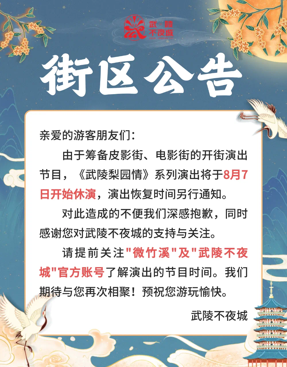 剛剛,武陵不夜城發布街區公告。由于籌備皮影街、電影街的開街演出節目,《武陵梨園情》系列演出將于今日(8月7日)起開始休演。演出恢復時間另行通知,請大家相互轉告不要跑空啦。