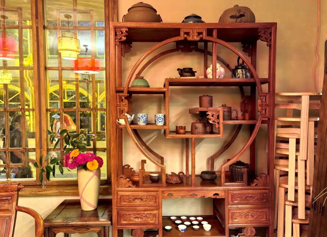 推開茶館門,東方美學(xué)撲面而來。仿古建筑里,古樸木架上擺滿精致茶具與茶葉禮盒,典雅中透著詩書氣;店外,假山石景、石壺流水相映成趣,一步一景皆入畫。鼻尖先被濃郁的茶香勾住,引得人不自覺咽口水——這便是梅子埡茶的魅力。