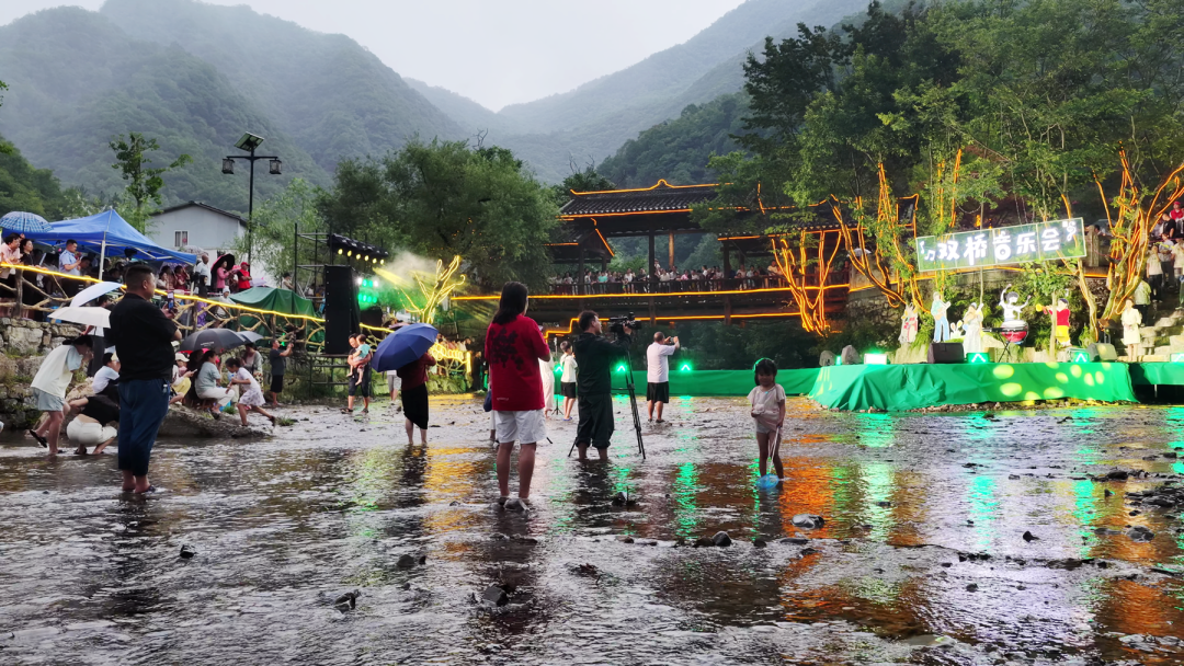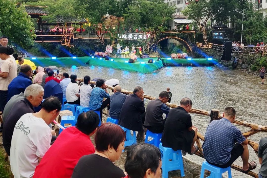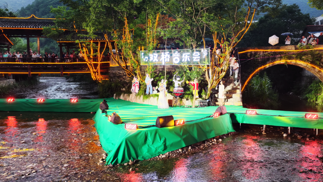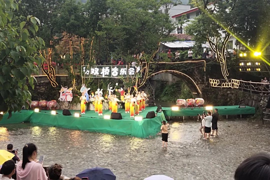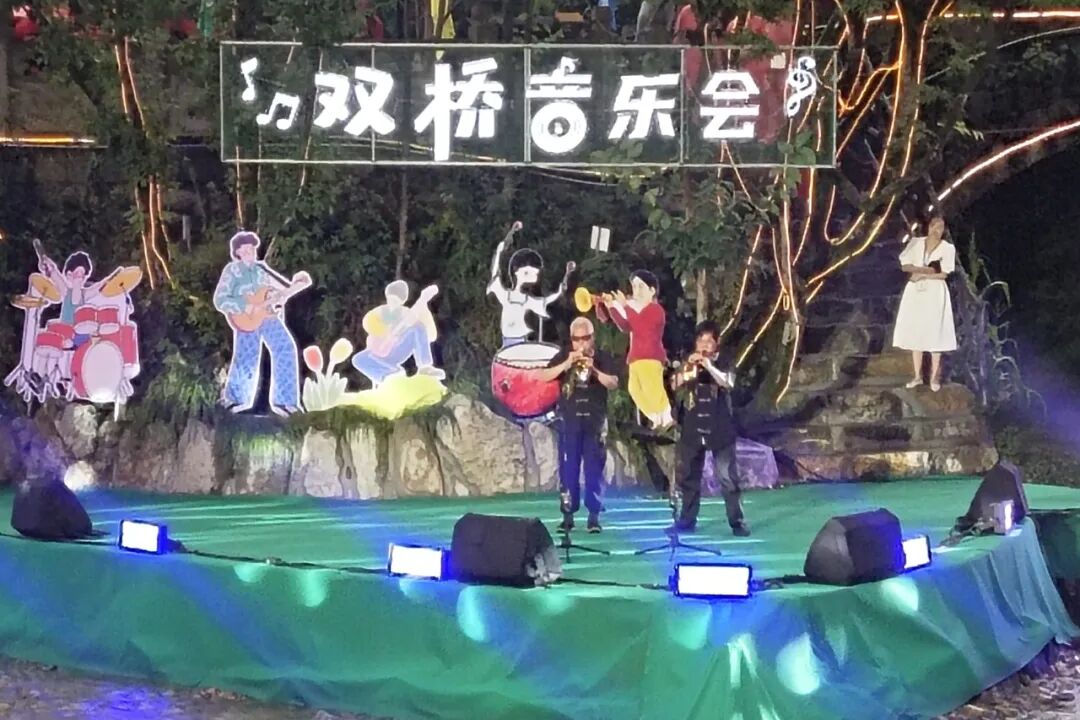 夜幕降臨,雙橋音樂會的開場將整個活動推向了高潮。主場設在雙橋村紅板壁廣場,分場則在天池露營區同時進行。現場燈光璀璨,與夜空的繁星相互輝映。本地達人紛紛登臺亮相,帶來精彩紛呈的表演。一首首改編歌曲和流行曲目,瞬間點燃了觀眾的熱情,大家跟著節奏搖擺身體,歡呼聲和吶喊聲此起彼伏。極具鄉土氣息的山歌對唱,演唱者們嘹亮的嗓音在山谷間回蕩,展現了當地獨特的民俗文化魅力,讓現場的游客們深深陶醉其中。令人眼前一亮的父子嗩吶秀,更是將非遺表演的魅力展現得淋漓盡致,父子二人默契配合,嗩吶聲時而高亢激昂,時而婉轉悠揚,贏得了陣陣熱烈掌聲。