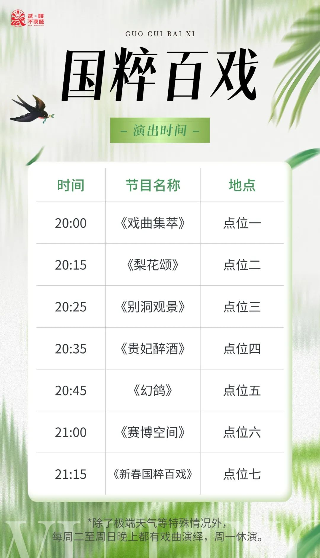 當夜幕降臨燈火點亮武陵不夜城這片歡樂天地,傳統(tǒng)與現(xiàn)代元素在此激情碰撞踏入其中,仿佛穿越時空感受撲面而來的熱烈氛圍。一場場視聽盛宴正等待著您來開啟現(xiàn)在為您呈上今日節(jié)目單,準備好迎接這場難忘的文化狂歡吧!