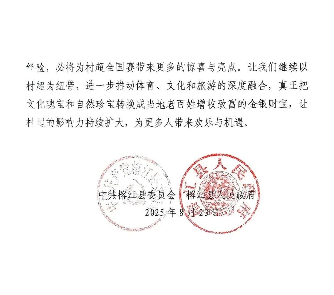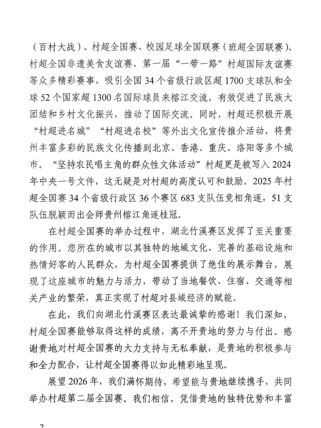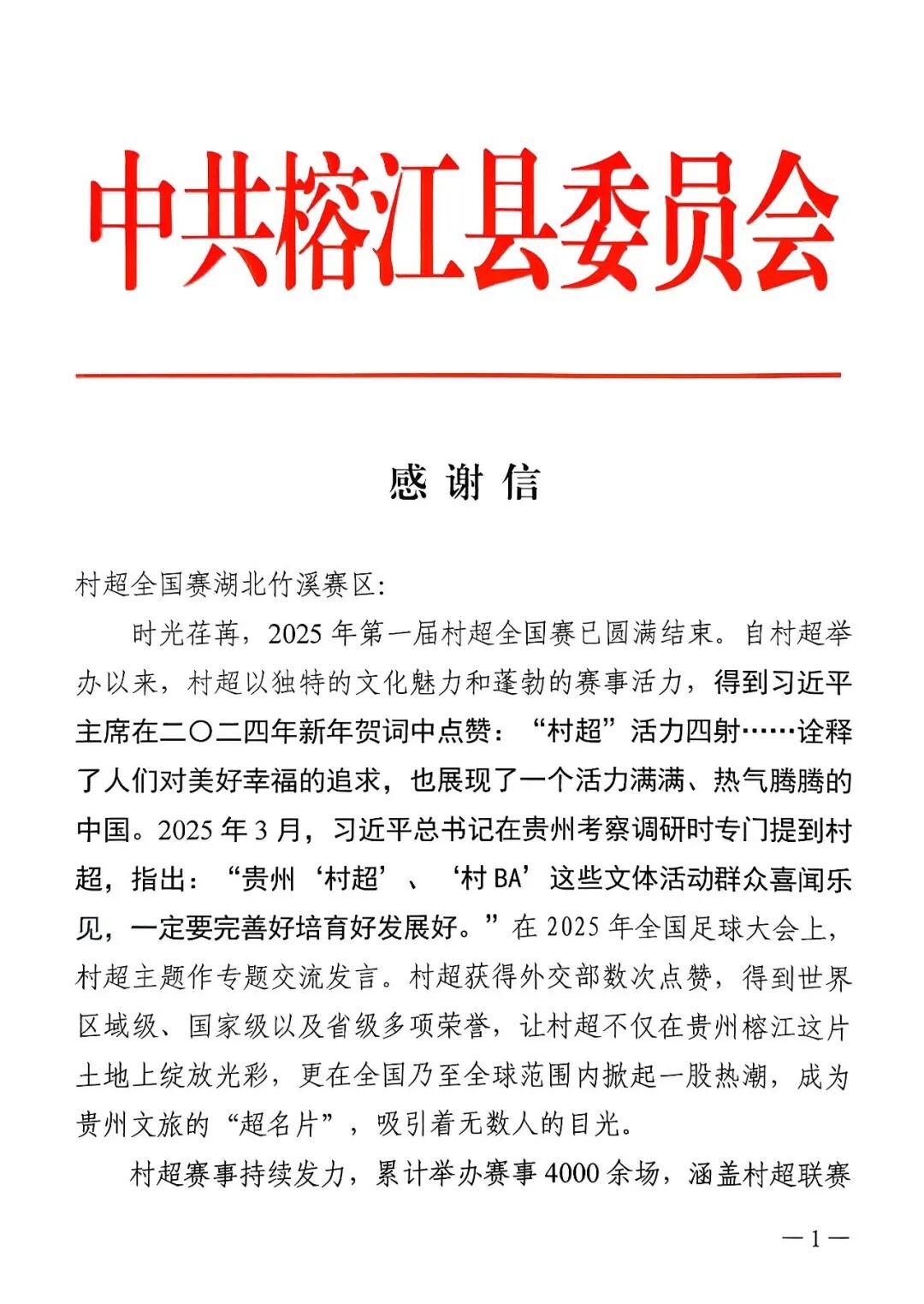 榕江在感謝信中著重指出竹溪賽區的出色表現為“村超”品牌注入了全新活力,為跨地區協同合作樹立了優秀典范基于雙方在“村超”賽事合作中的良好基礎與共同愿景。