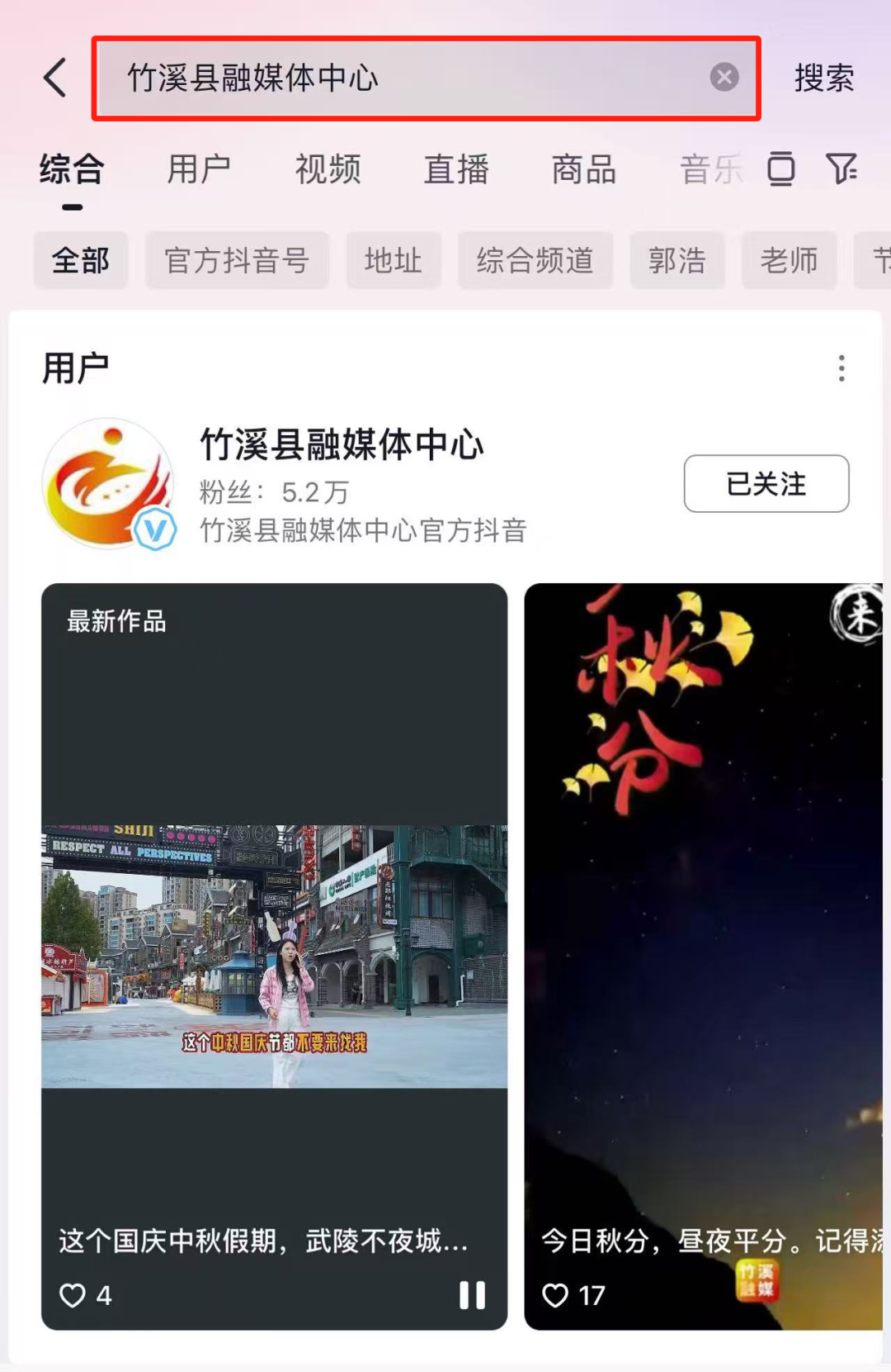 或者,在搜索框內輸入抖音號【ZXRM】(*“竹溪融媒”首字母),關注【竹溪縣融媒體中心】官方抖音,準時收看直播。