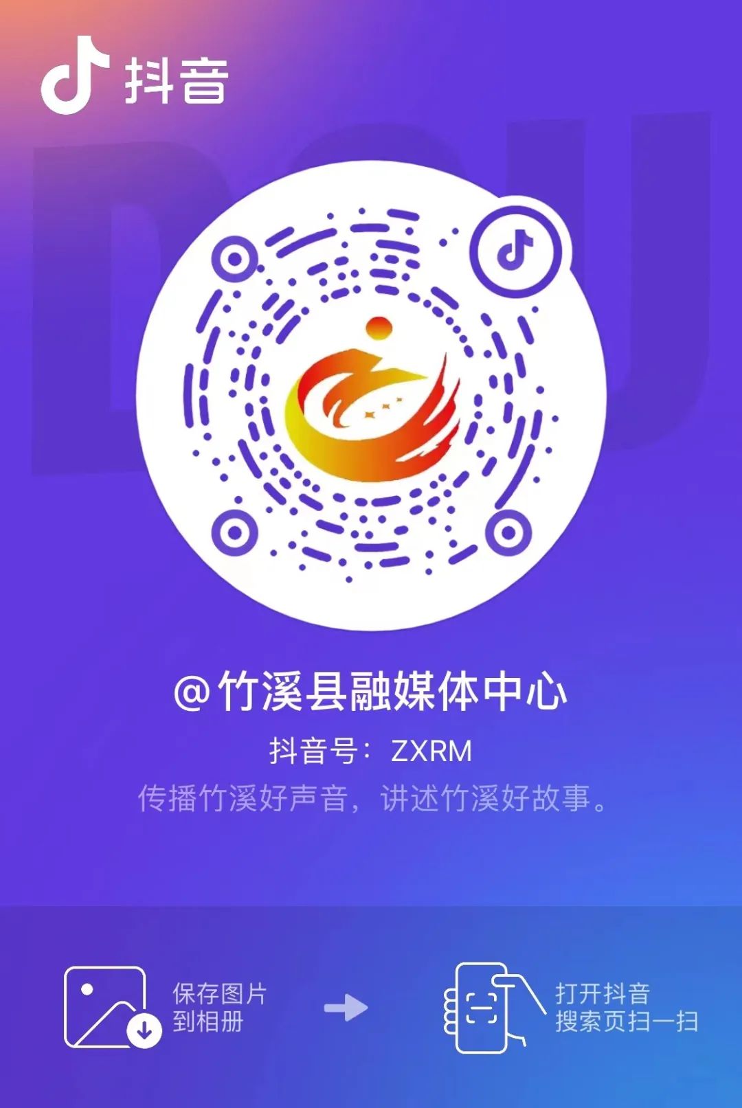 方式二:保存下圖至手機相冊,打開【抖音】APP點擊搜索框最右邊的“相機”符號進行識別關注【竹溪縣融媒體中心】官方抖音