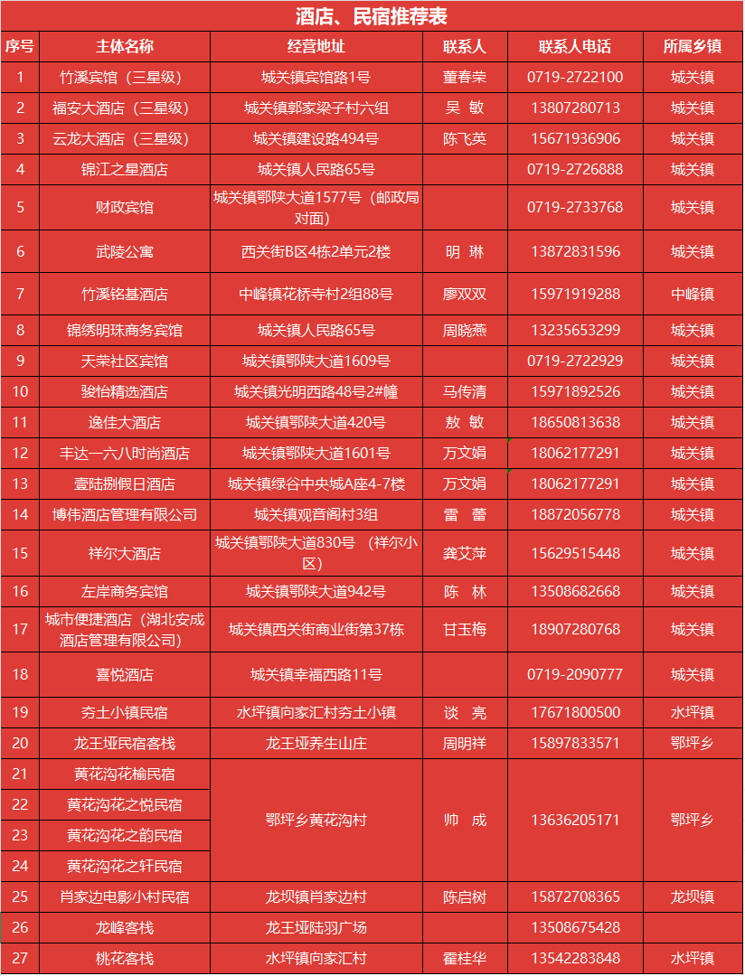 1.竹溪賓館(三星):城關鎮賓館路1號,步行6分鐘到武陵不夜城,電話:2722100。