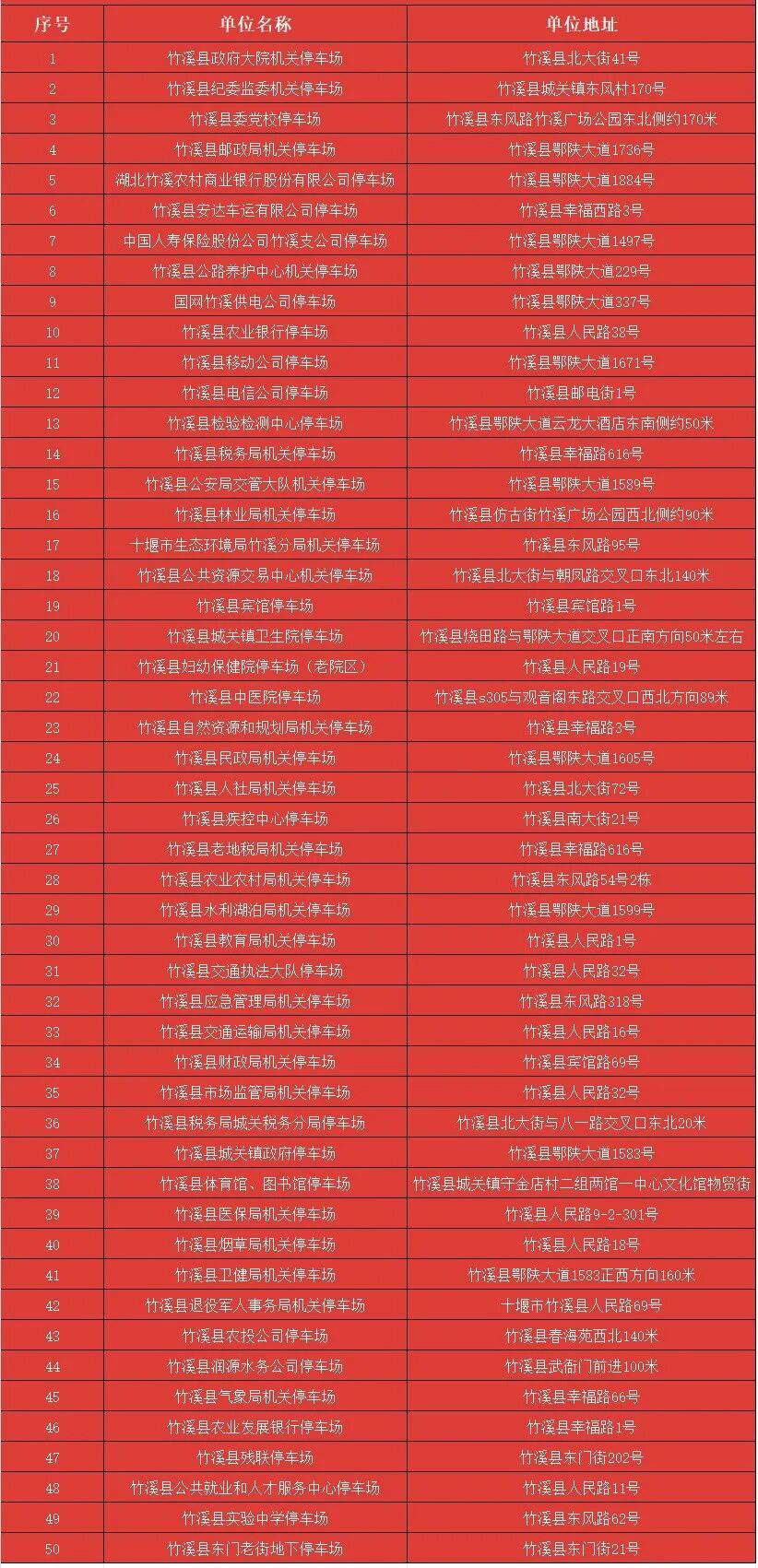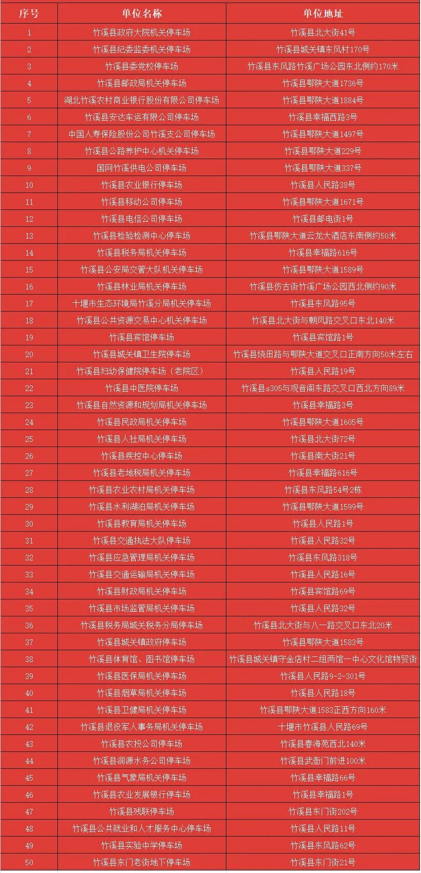 3.免費停車交通惠民:節日期間,城區北環路、西關街、幸福西路等沿線設置臨時停放區,竹溪縣城區機關企事業單位內部停車場和部分物業小區免費開放停車。