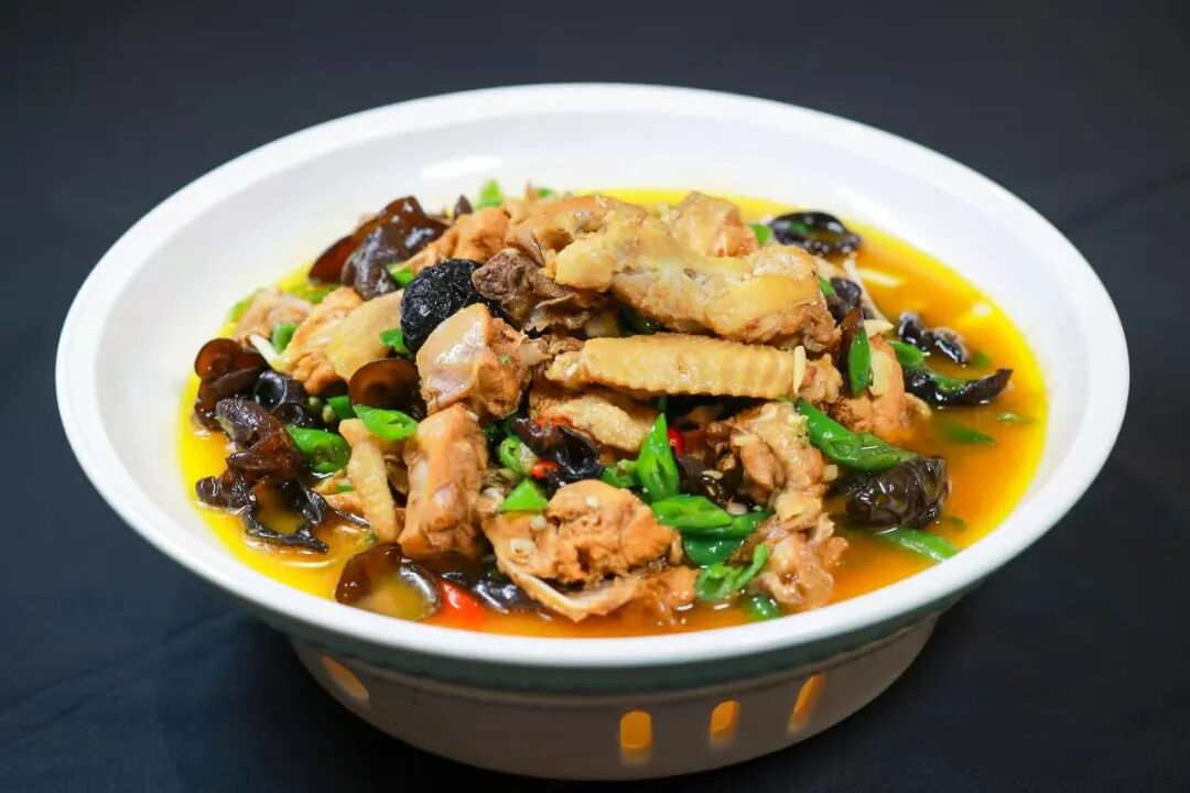 精選深山散養土雞,肉質緊實彈牙,搭配酸辣尖椒和爽脆木耳,食材豐富多樣,味道層次分明。