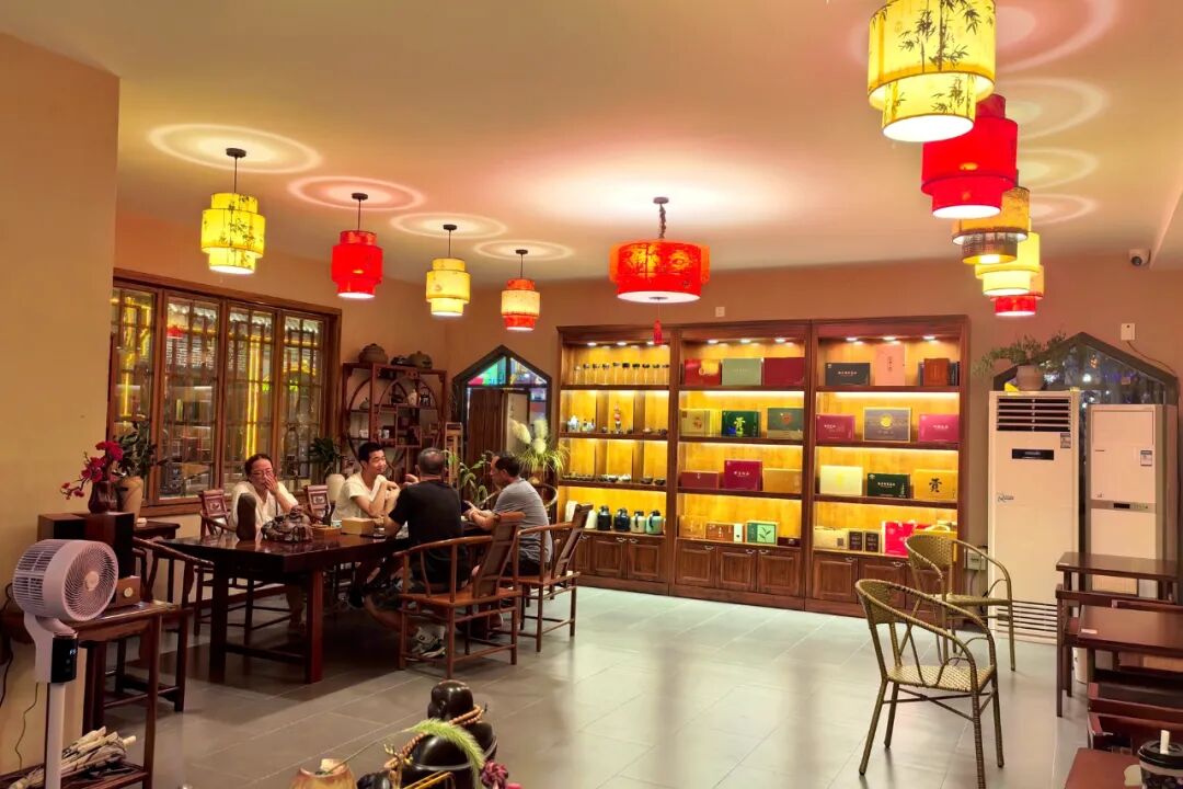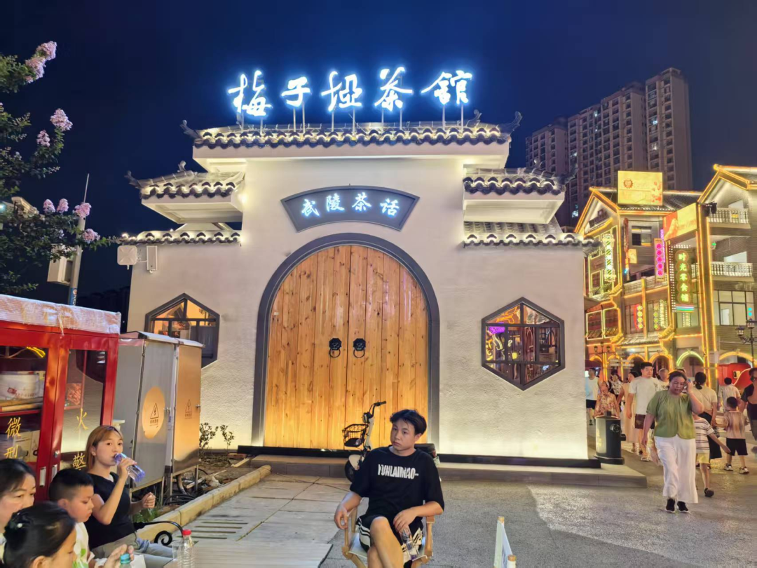 位于武陵不夜城的梅子埡茶館,是竹溪貢茶的“活名片”,亦是茶旅融合的重要節點。館內有貢茶展銷、茶藝表演與現代化茶飲區,可品原葉茶、購高山毛尖等,仿古建筑搭配古樸茶具、假山石景盡顯東方美學。