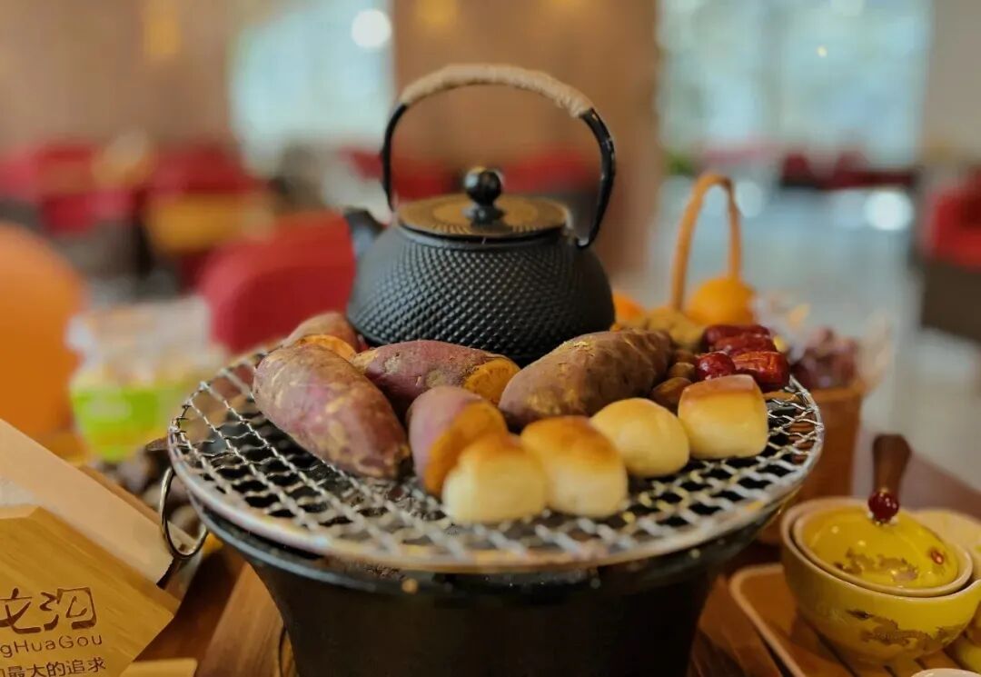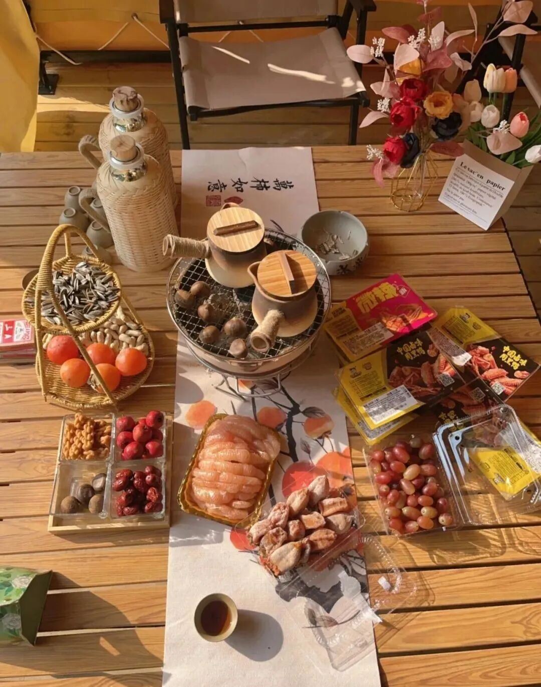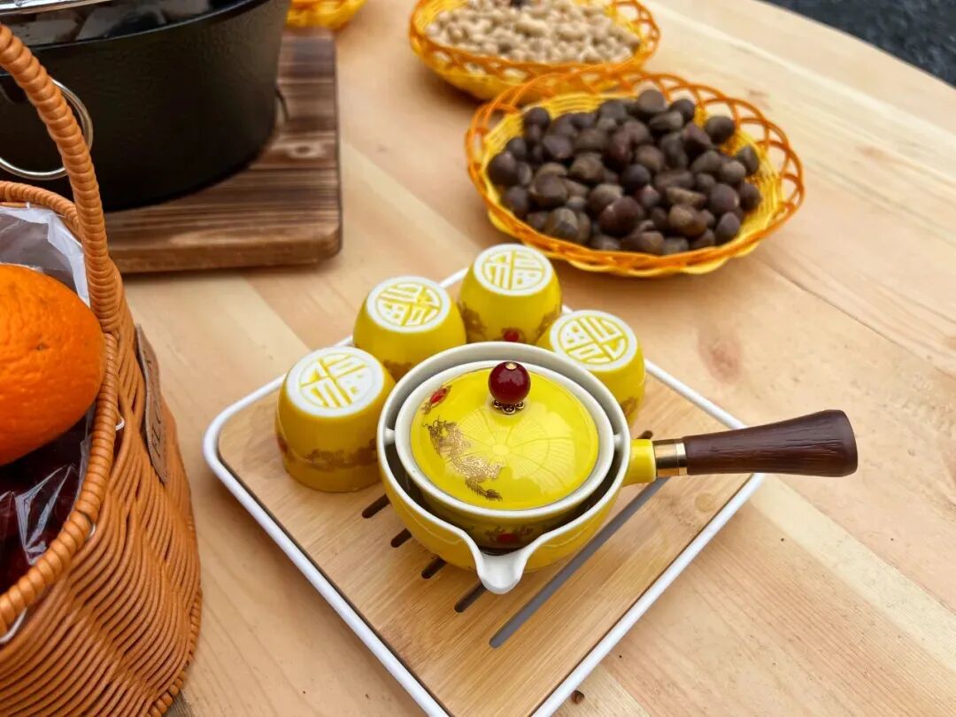 炭火升起,暖意融融,煮上一壺醇厚的竹溪綠茶,茶香便與松濤的清香融為一體。搭配烤得流心的芝士紅薯、脆甜的糖炒栗子,及小院自制的精致小食,每一口都是大自然的饋贈,是獨屬于秋日的豐腴與香甜。此時唯有耳畔松風低語,手中茶湯溫熱,這份將身心全然交付自然的松弛感,是對奔波于塵世的人們最溫柔的治愈。
