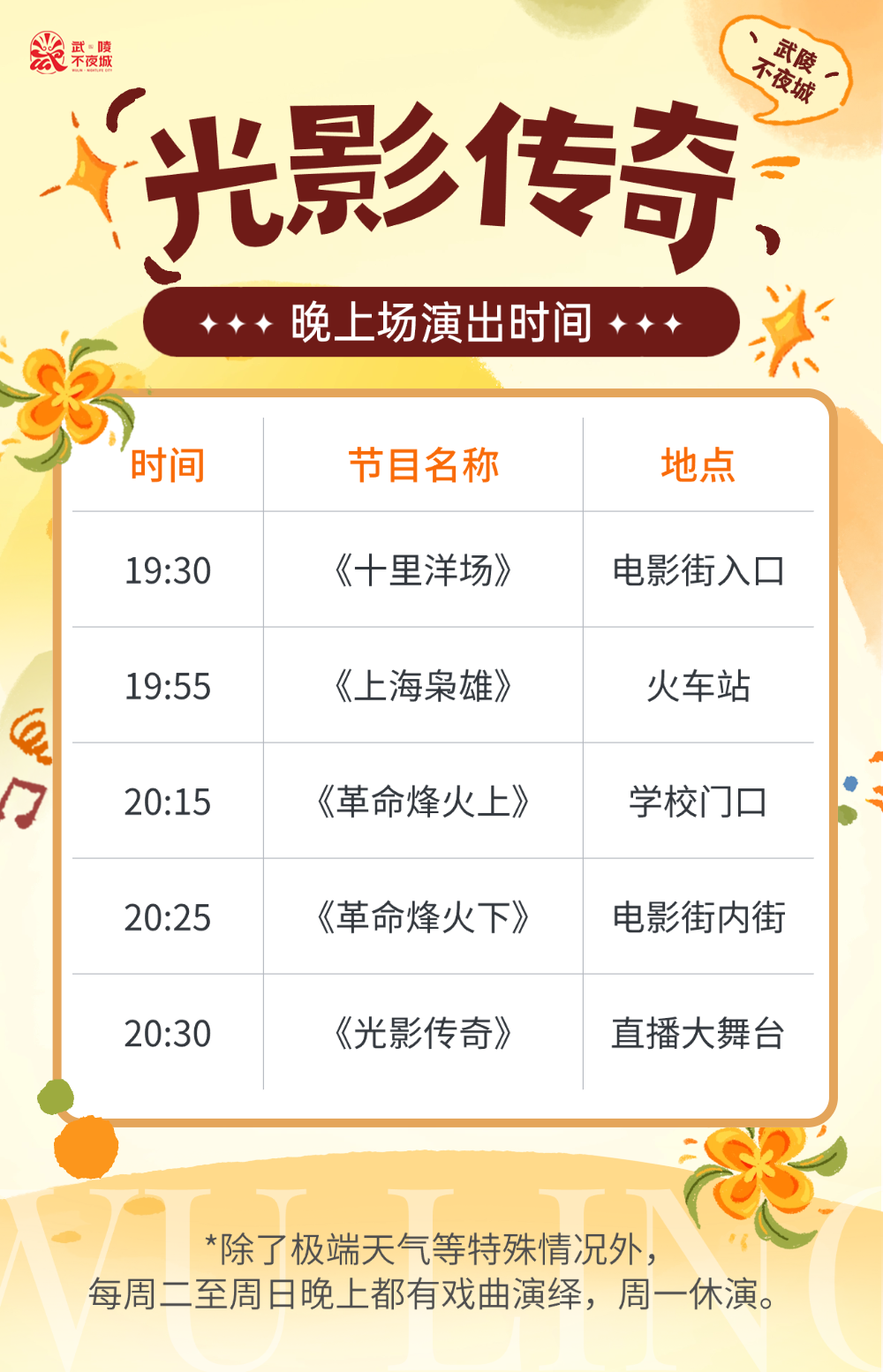 華燈初上,好戲開演!武陵不夜城今日精彩,趕緊收好這份熱乎的節目單,共赴一場“小城有戲·慢養竹溪”的浪漫夜游之約吧!