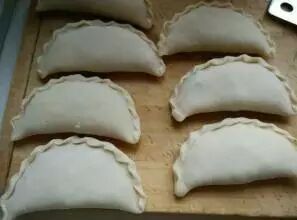 3.把半燙面搟成合適大小的皮,把韭菜雞蛋餡兒包進去,周邊用手指壓實,然后捏成花邊。