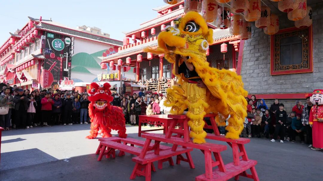 舞獅表演《雄獅獻瑞》以其高難度的表演讓觀眾嘆為觀止,其表達的美好寓意更是深得人心,引得游客叫好連連,眾多游客在主持人的引導下紛紛與雄獅互動,撫摸雄獅,以圖好運加滿、接福納祥的美好寓意。登鼓表演《財源滾滾》,一面面響鼓在演員的雙腳下,如輪飛轉,靈動多姿;特色雜技《步步高升》,演員在一個個高疊的椅子上以手做支撐,挑戰一個個高難度的動作,精彩刺激的表演引來了觀眾的陣陣掌聲;舞蹈《國潮快閃》《俏花旦》將戲曲、現代舞蹈相融合,演員和觀眾在動感國風的音樂聲中翩翩起舞;柔術《繁華似景》中,演員們更是將力量與柔美相結合,一個個不可思議的高難度動作為游客獻上了極具沖擊的視覺盛宴。