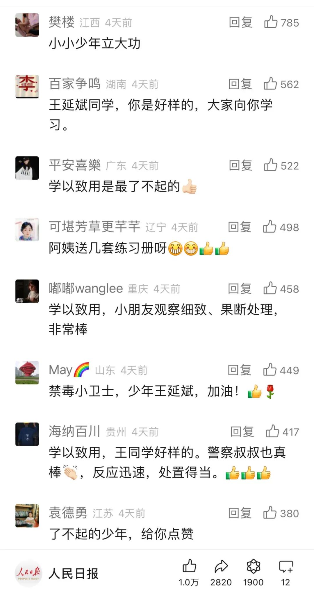 各大媒體重點報道后,全國各地網友紛紛留言,為王延斌同學點贊,同時為竹溪禁毒宣傳教育點贊。