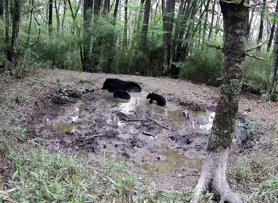 在拍攝的影像里看到,三只野生黑熊,一大兩小,通體黑鬃毛,根據體態辨別,可能是一只熊媽媽帶著兩只熊寶寶出來捕食、玩耍,狀態良好。它們先后在多個布設的紅外相機鏡頭前覓食,在森林里嬉戲,還在積水的泥潭里飲水和洗澡,畫面格外萌趣可愛。