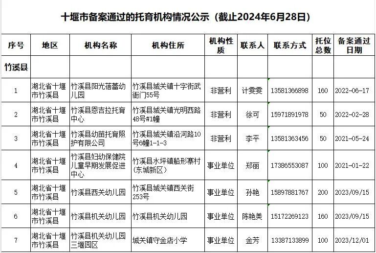 近日,市衛生健康委員會發布2024年度十堰市備案托育機構名單公示,涉及78家機構,其中竹溪7家。