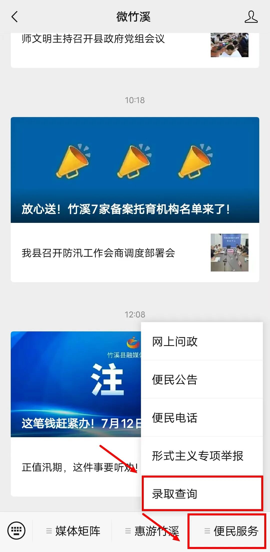 關注微竹溪微信公眾號,在底部菜單欄點擊【便民服務】→【錄取查詢】即可進入查詢通道進行查詢。