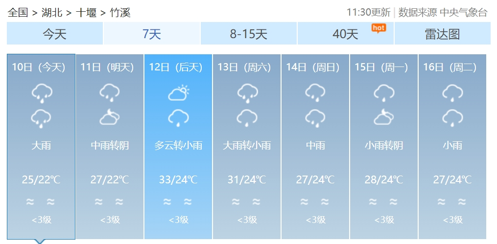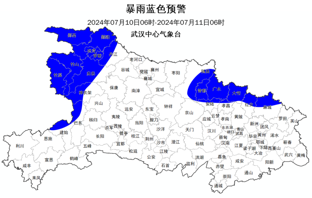 預(yù)計(jì)7月10日8時至7月11日8時,十堰、神農(nóng)架、恩施北部、隨州、孝感北部、黃岡北部有大到暴雨,局地大暴雨,請注意防范。