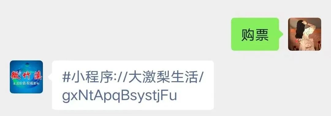 關注微竹溪微信公眾號,在對話框輸入關鍵詞“購票”,點擊彈出的購票小程序鏈接即可進入購票。
