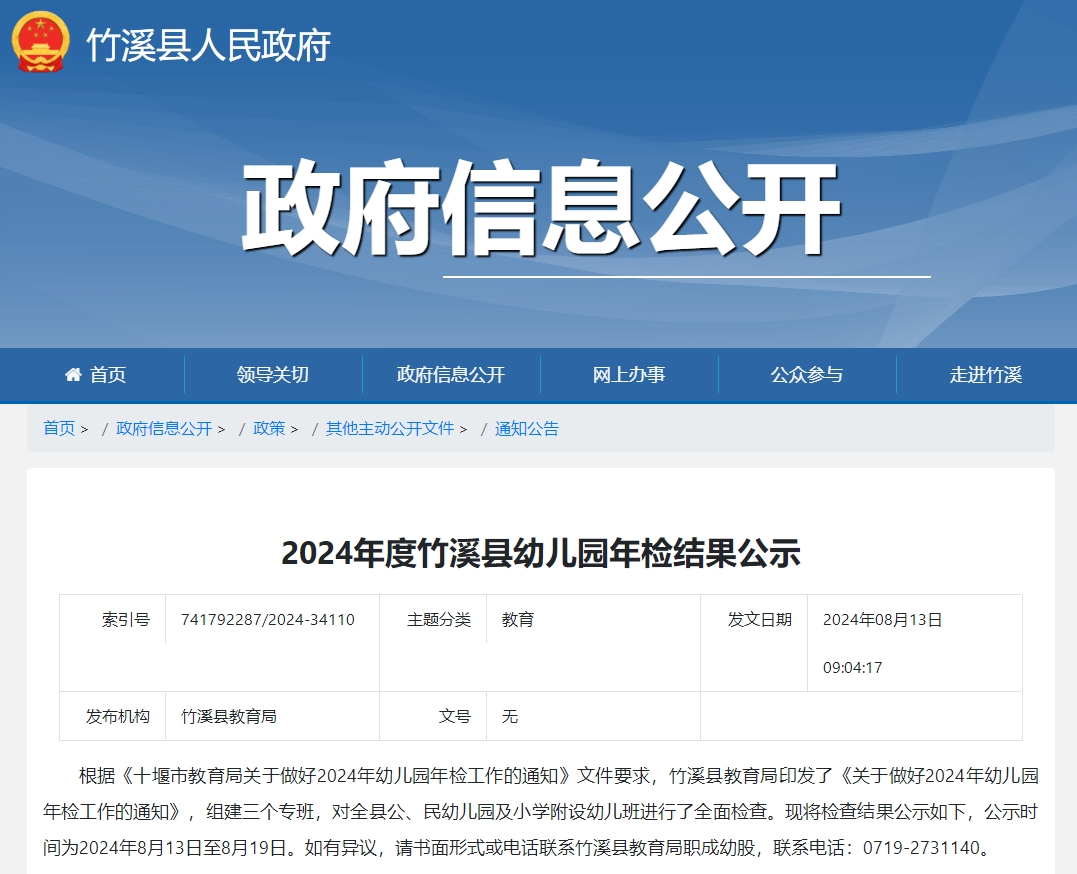 根據(jù)《十堰市教育局關(guān)于做好2024年幼兒園年檢工作的通知》文件要求,竹溪縣教育局印發(fā)了《關(guān)于做好2024年幼兒園年檢工作的通知》,組建三個(gè)專(zhuān)班,對(duì)全縣公辦、民辦幼兒園及小學(xué)附設(shè)幼兒班進(jìn)行了全面檢查,現(xiàn)將檢查結(jié)果公示如下,公示時(shí)間為2024年8月13日至8月19日。