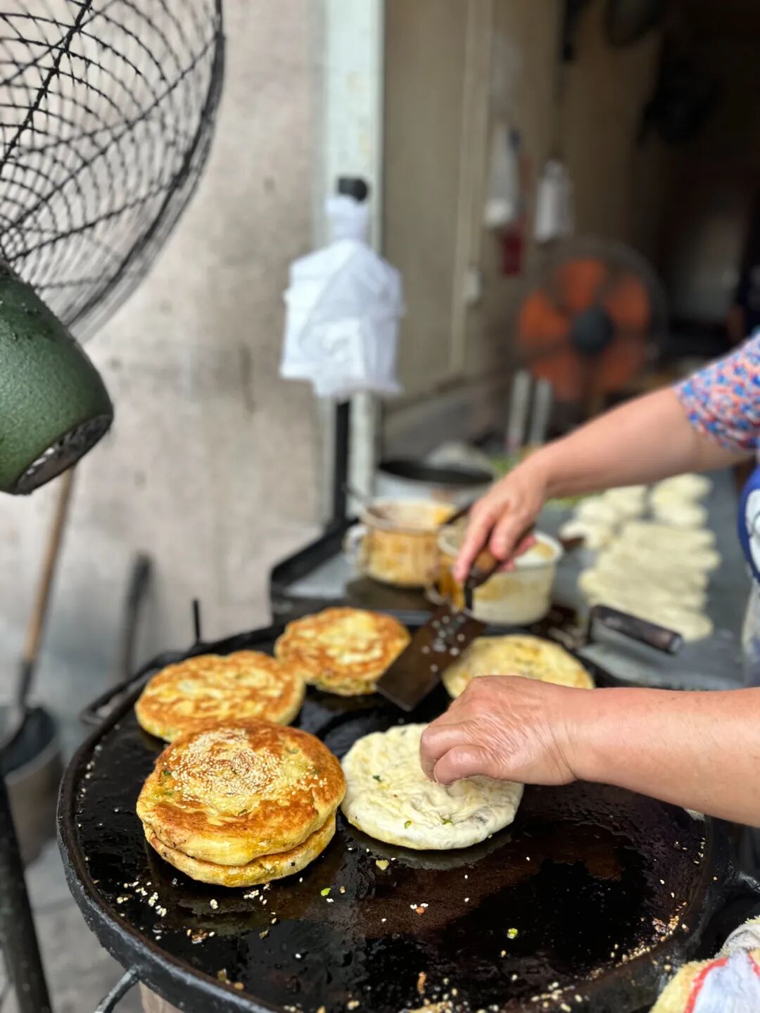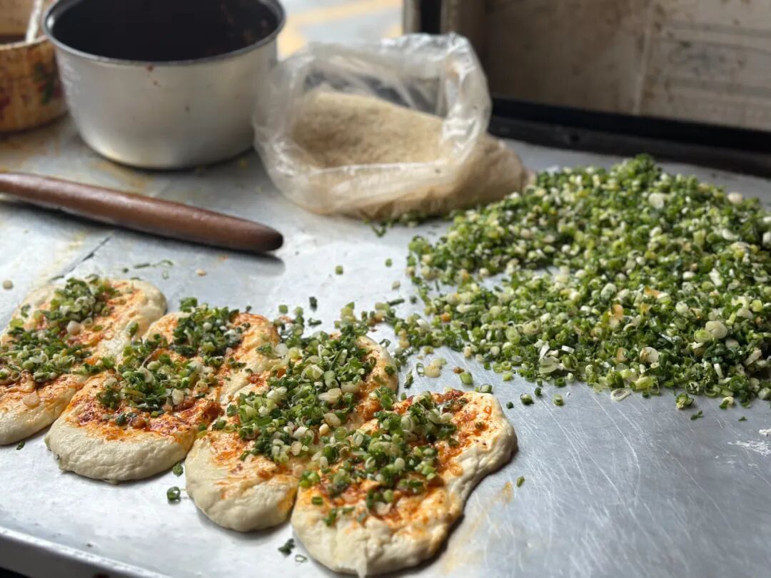 杜香春嫻熟地拿油刷著爐子,等油熱的時間,把面團大小均勻地掐下來,面粉不能太硬也不能太軟,這些她拿手捏捏就有數。涂上一層酥油,撒上一點細鹽,再放上一把翠綠的切得極細均勻的小米蔥花,一個餅一把蔥,一天下來,蔥都得用掉大幾十斤。