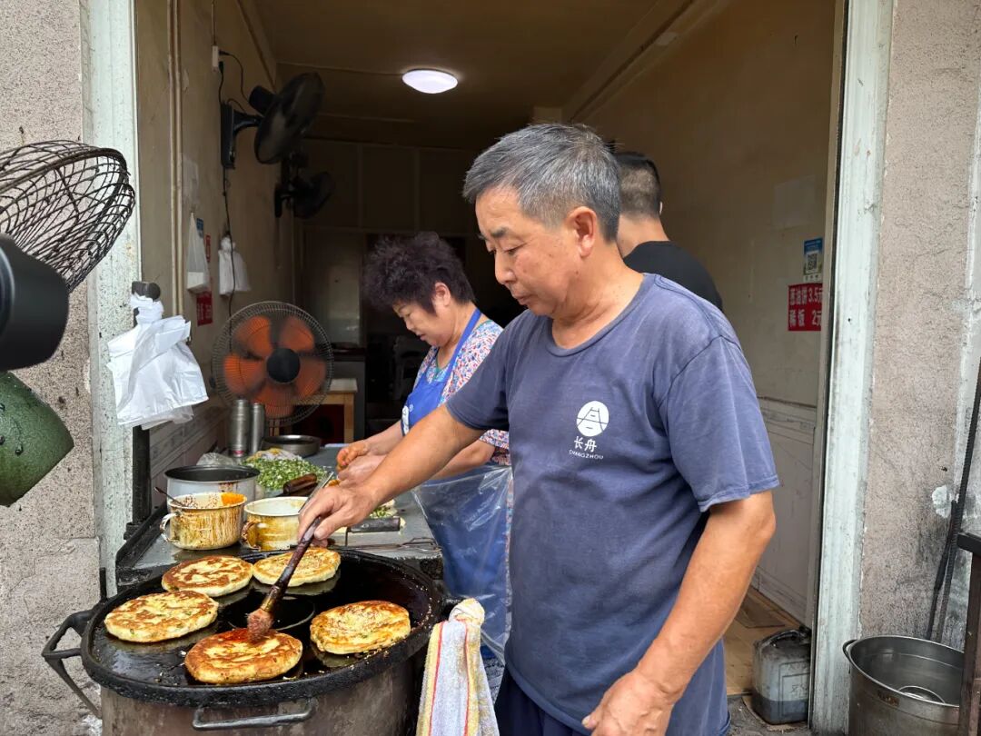 揉搓、放餡、壓平實、下鍋,一氣呵成。杜香春一邊揉面一邊告訴記者,蔥油餅雖然工序不算復雜,但非??简灱毠?,面是否柔韌、食材是否新鮮干凈、餡放多少合適以及油溫控制得好不好,都會影響蔥油餅的口感和味道。