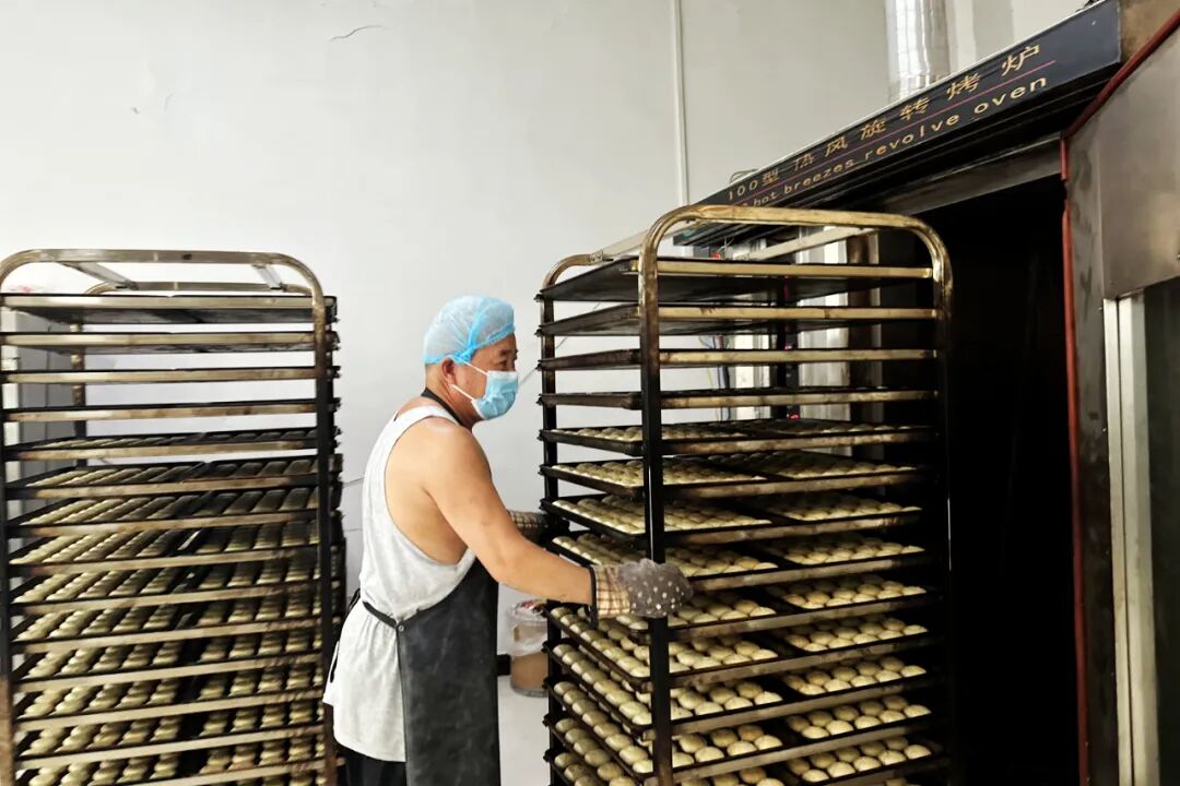 手工制作的月餅,經過烘烤箱慢慢旋轉;打開烤箱的一刻,濃郁的餅香味撲面而來。