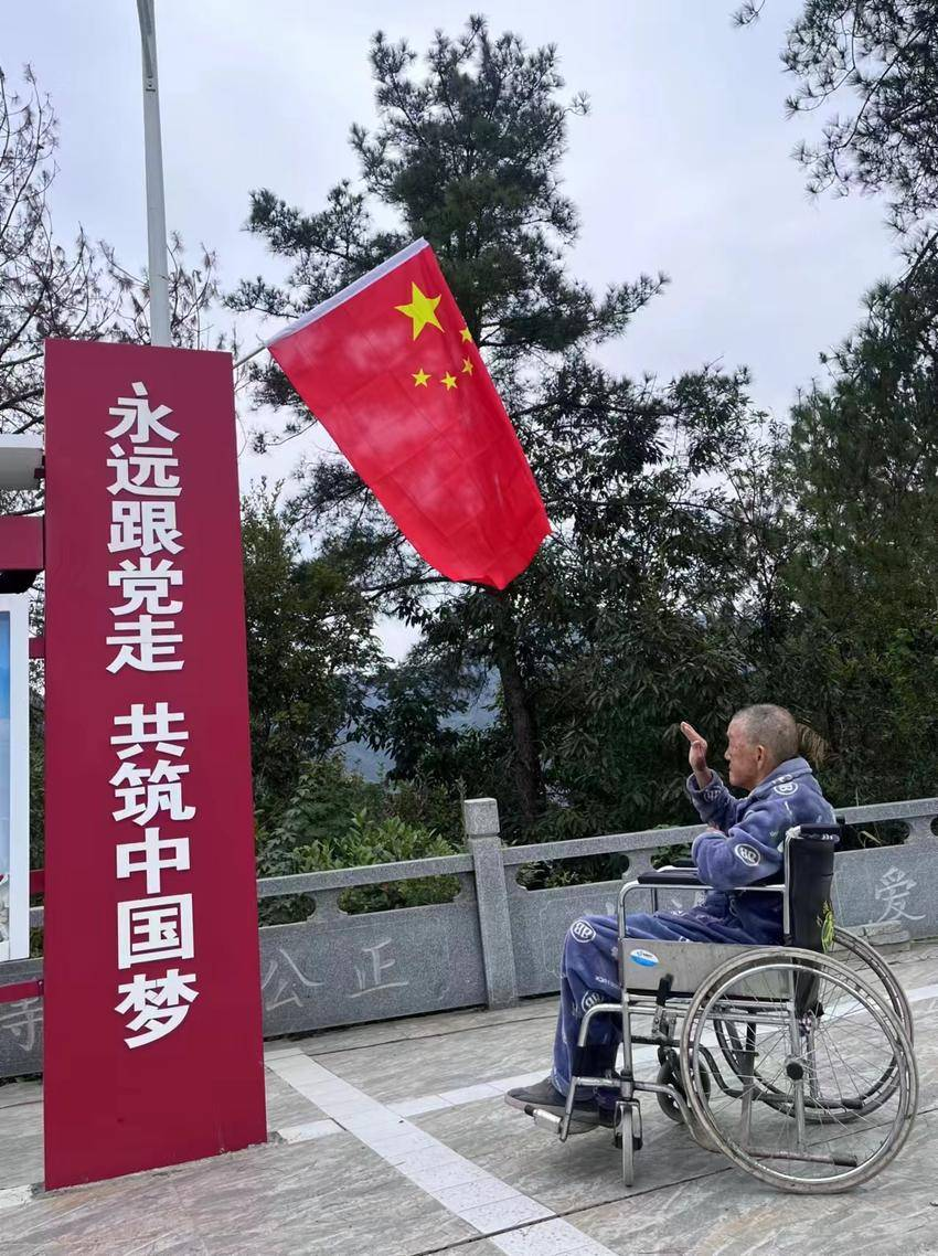 剛剛坐著輪椅到鎮上黨建文化廣場,向國旗敬禮后回家躺床休息的陳映奎,激動地拉起老朋友的手,連連說道:“我有四個重孫,兩個已光榮入黨。我們子子孫孫、世世代代跟黨走!”