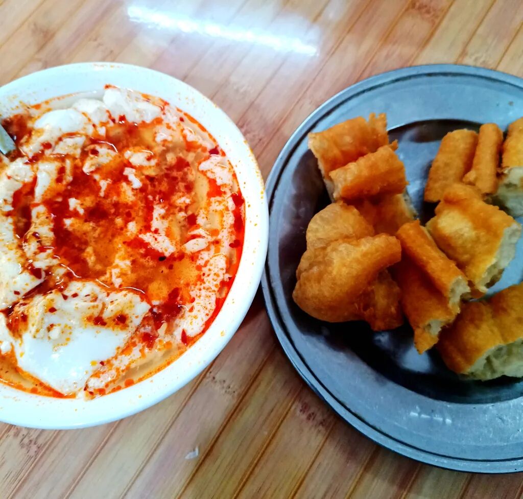 街頭,一個叫“西施”的美貌女子,正忙著加工竹溪人最愛的早餐組合:在油鍋里翻滾著油條,變得金黃,就撈出瀝油,再趁熱切開分成段,淋上秘制的大蒜辣子蘸料,吃一口下去,酥脆飄香。再配一碗豆腐腦兒、豆漿,那才叫“過早”吃得“過癮” 。