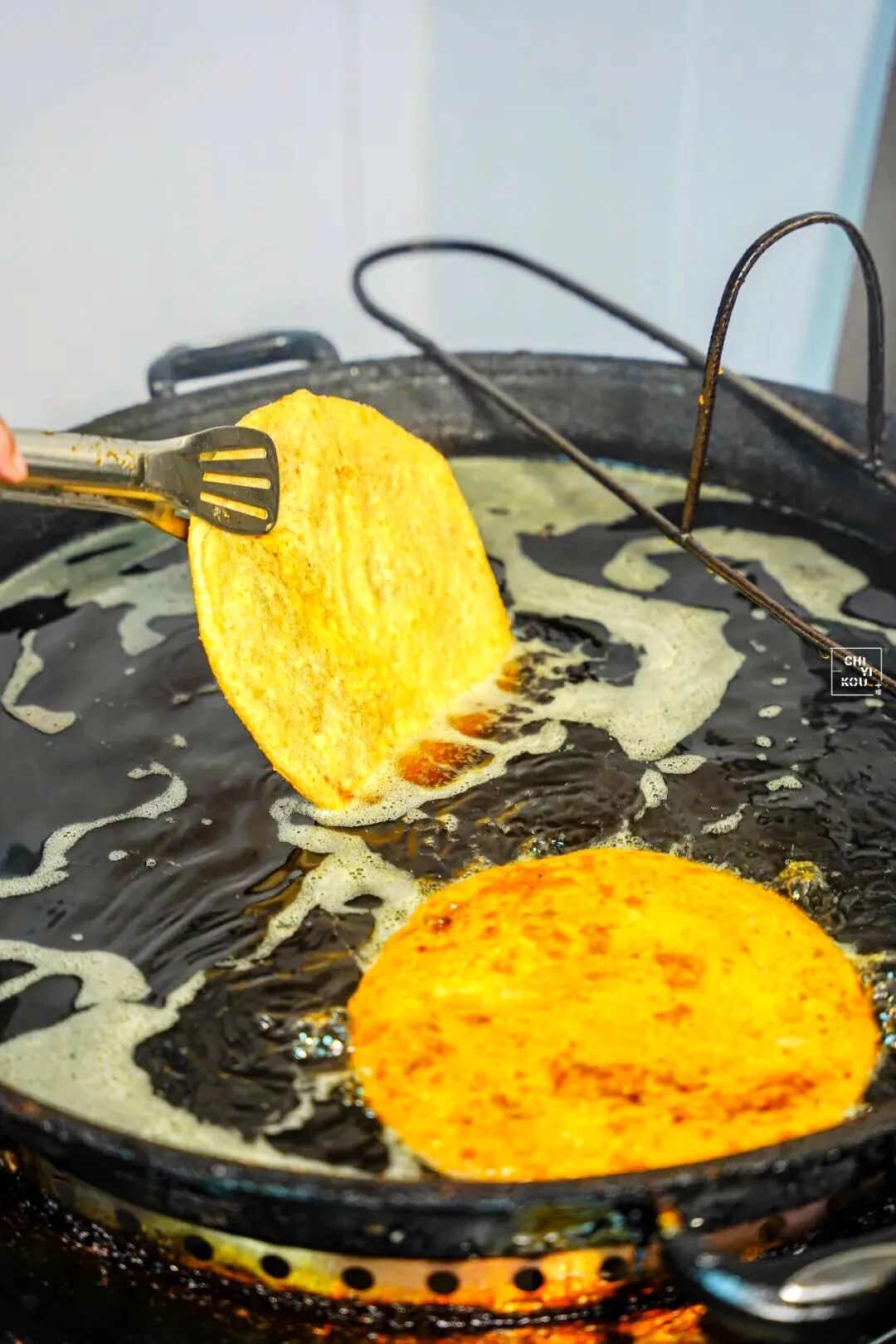 讓人垂涎欲滴的牛肉火燒(油餅),是“瘦哥”先將牛肉剁碎,加入蔥姜蒜等調料攪拌均勻做餡,再把面團搟成薄餅,鋪上牛肉餡,卷起來壓成餅狀,放入鍋中煎至兩面金黃,香氣四溢。