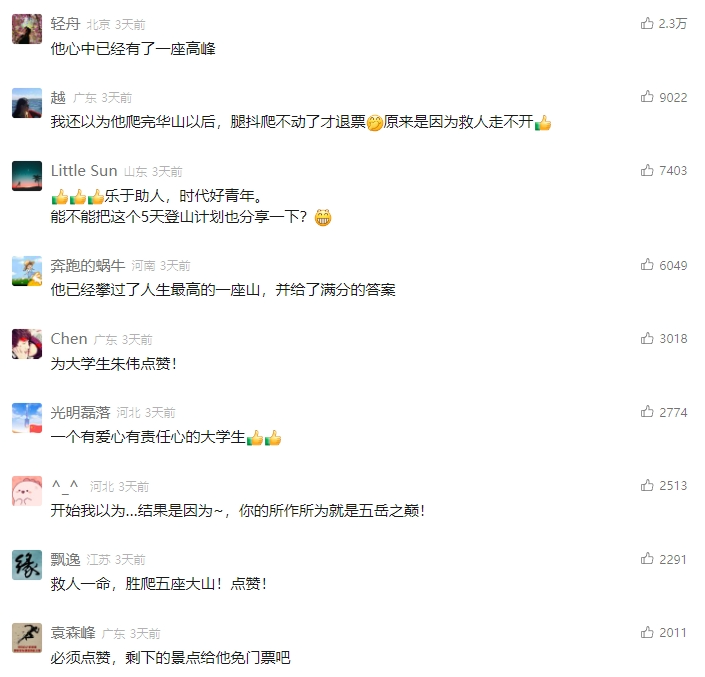華山突發(fā)!朱偉(男,襄陽學生)出手!10月18日,朱偉“退12張票救人”的事跡經(jīng)過湖北日報新媒體報道后引發(fā)廣泛關注,網(wǎng)友們紛紛為他挺身而出的行為點贊。人民日報微信、新華社微信等也紛紛轉(zhuǎn)發(fā)報道。隨后,衡山、恒山、嵩山、泰山等景區(qū)輪流向朱偉隔空喊話,提供免費門票,助力他早日完成“五岳”打卡挑戰(zhàn)。21日晚,武當山風景區(qū)也加入其中,決定向朱偉贈送武當山所有A級以上景區(qū)門票。誠邀他到金頂、武當山快樂谷景區(qū)、武當太極湖旅游度假區(qū)、武當民俗文化產(chǎn)業(yè)園等A級以上景區(qū)打卡、挑戰(zhàn)自我,讓他感受“五岳歸來不看山,看武當,方知山外有山”的大岳之美。