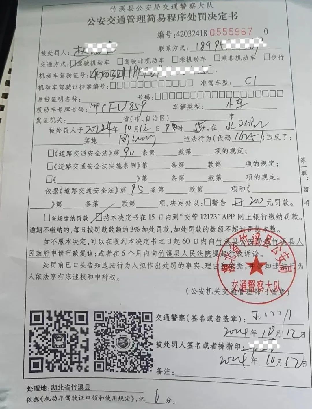 2024年10月12日9時55分,趙某惠駕駛鄂CFU859小型車,在北環路工業園區紅綠燈路口闖紅燈,被竹溪大隊稽查布控查獲并依法予以處罰。當日,民警對其開展“敲門行動”,駕駛人現場簽訂《踐行“文明交通”承諾書》,并上路開展文明交通勸導。