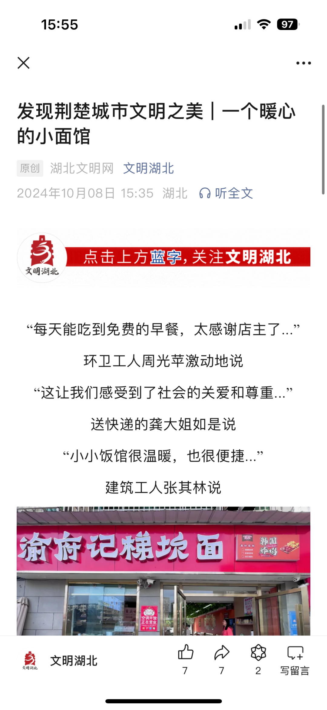 日前,《文明湖北》刊登竹溪縣城關鎮公園路一家愛心早餐店。經了解,渝府記梯坎面館今年7月1日開業,三個月來,累計贈送粥3600余碗、免費雞蛋750個,服務過36個環衛工人、23個快遞小哥、15個建筑工人、6個退役軍人、4個孤寡流浪老人……