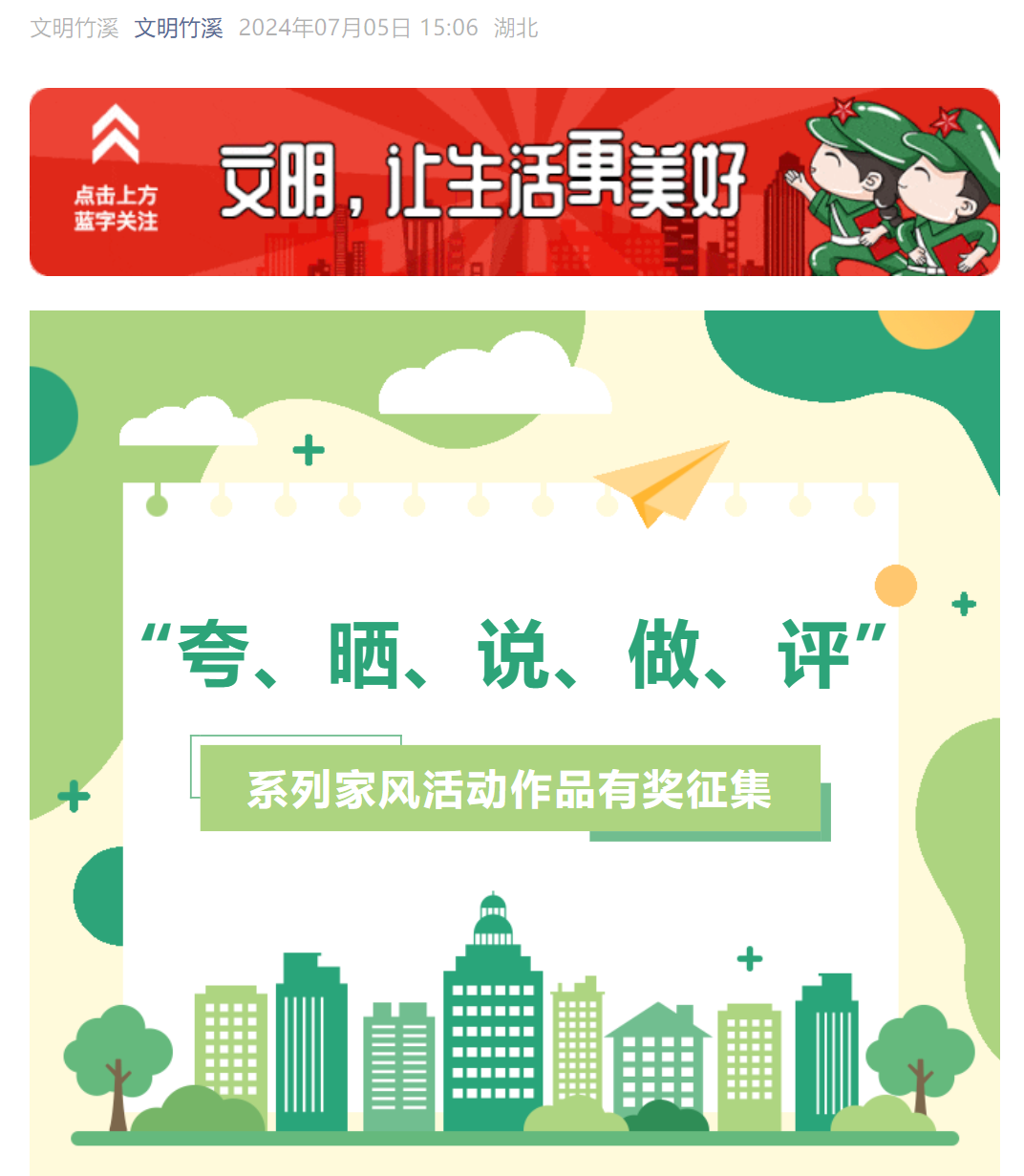 為深入學習貫徹習近平總書記關于注重家庭家教家風建設的重要論述,按照《關于印發〈竹溪縣2024年深化家風建設系列活動的實施方案〉的通知》(溪文明辦〔2024〕10號)要求,竹溪縣精神文明建設辦公室和竹溪縣供銷社聯合在全縣范圍組織開展系列家風活動作品有獎征集。