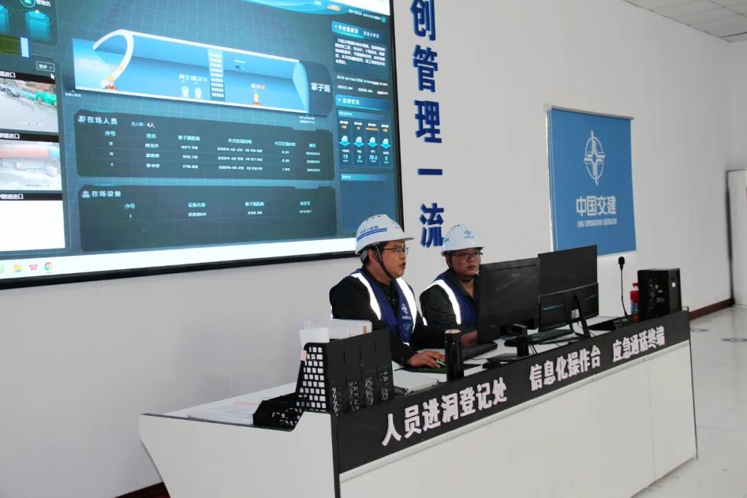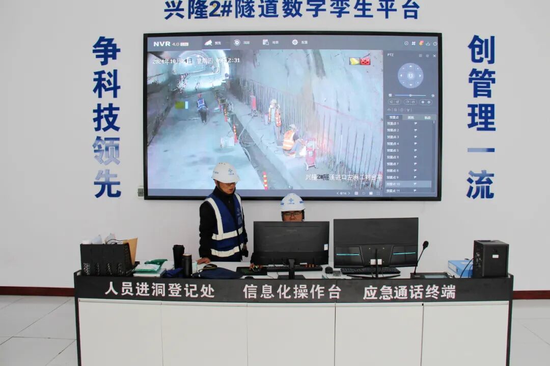 在十巫南高速項目最長的隧道——興隆2號隧道進口的大屏幕上,數字孿生平臺實時更新著洞內施工作業人員定位、車輛定位、氣體監測、視頻監控、隧道門禁等施工動態;隧道內,施工人員和平常一樣,有條不紊地進行著各項開挖、澆筑等施工作業。