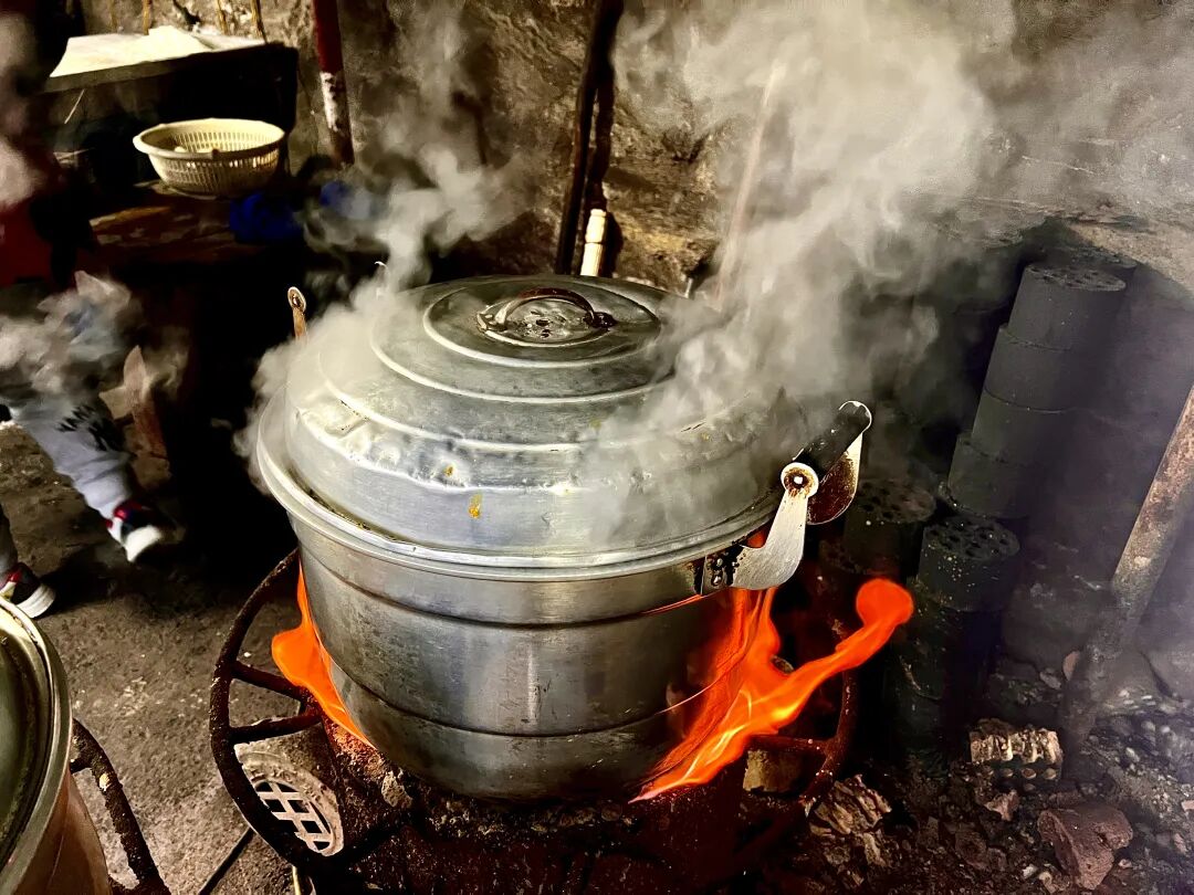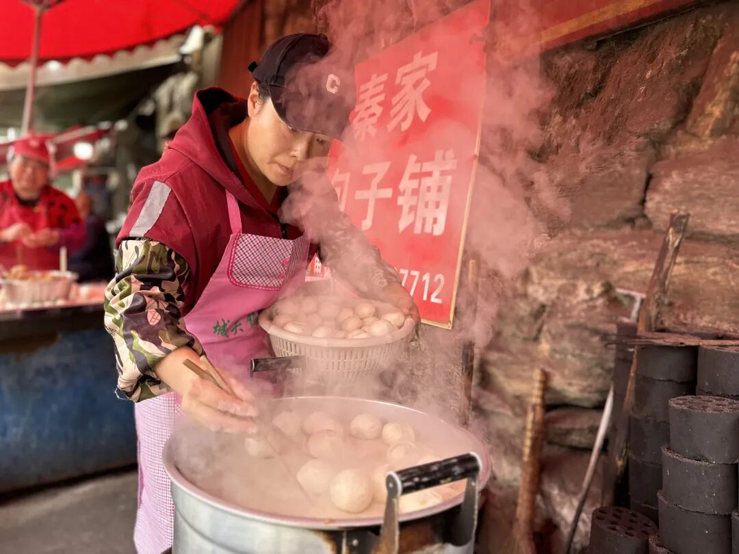走在青石鋪至的街道,穿過老城門洞,便可看到有許多食客拿著盤子排隊等候的場面。大家圍著煤爐上一口碩大的鋼精鍋翹首以盼,等待美味出爐。老板揭開鍋蓋,一個個雪白的包子胖嘟嘟地藏在熱氣騰騰的霧氣中,肉餡的鮮美與面團發酵后的麥香撲鼻而來,此刻食欲被撩撥到了頂峰。在這里吃小籠包是要拼手速的,出鍋后的包子還未等老板分發,食客們就已經迫不及待開啟“自助模式”,一搶而空。