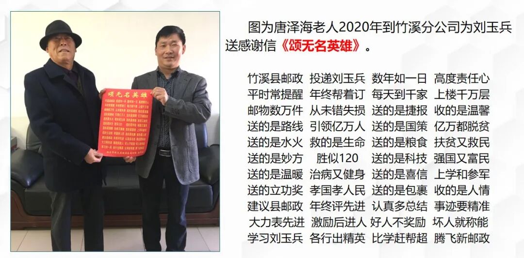 2020年,有一位80歲老人唐澤海,家里只有他和老伴兩個人,劉玉兵就經常利用送報刊的機會去老人家幫忙修通水電管道,代買米面油等。劉玉兵知道老同志喜歡讀報紙、雜志,無論刮風下雨,都會按時將老人訂閱的報刊送到。后來老人地址變更,但還是聯系劉玉兵訂報刊,每次他都會說:“小劉子,你莫給我轉段道。無論哪個投遞,我這我反正就只認你,你比我自己的孩子還貼心,你投遞我放心,你哪一天沒來我還不習慣呢。”2020年底,唐澤海老人專程到竹溪郵政分公司為劉玉兵送來感謝信《頌無名英雄》