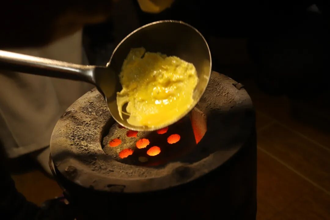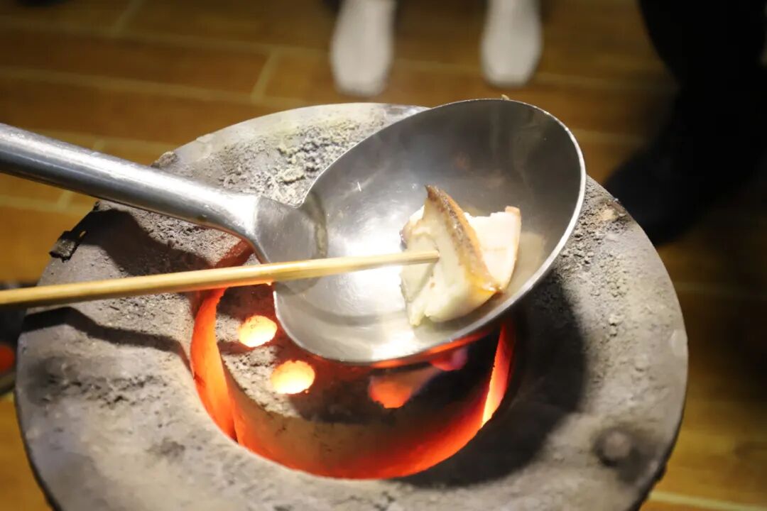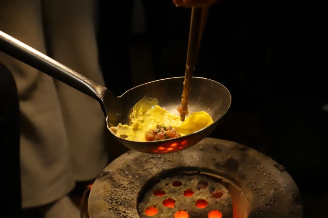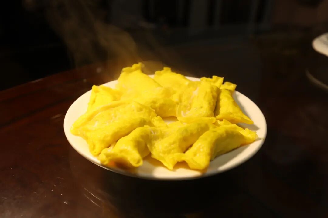 最上層的蛋餃也十分講究,這家的蛋餃由一位有著幾十年廚藝的阿嬤專門制作,只見她用一塊農家土豬肉的肥肉均勻抹在長柄鐵勺上,經過煤爐烤制,豬油滋滋作響,然后緩緩淋上土雞蛋液,待蛋液成餅狀后放入自家打的肉餡用筷子夾緊,一個色澤金黃的雞蛋盒子就做好了。