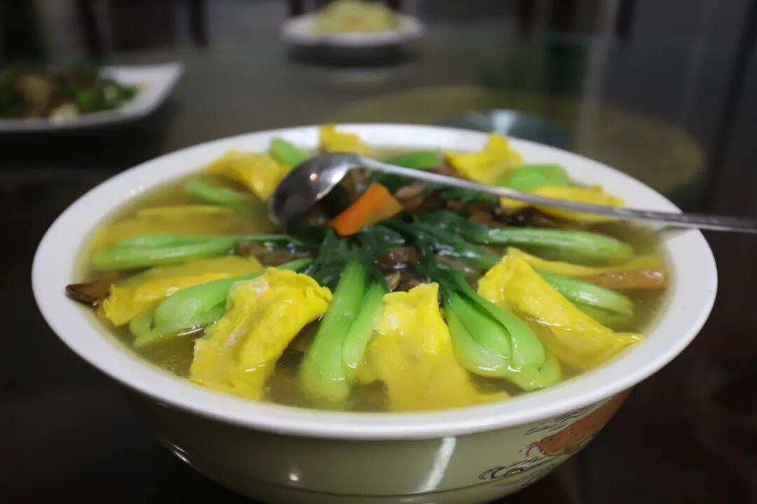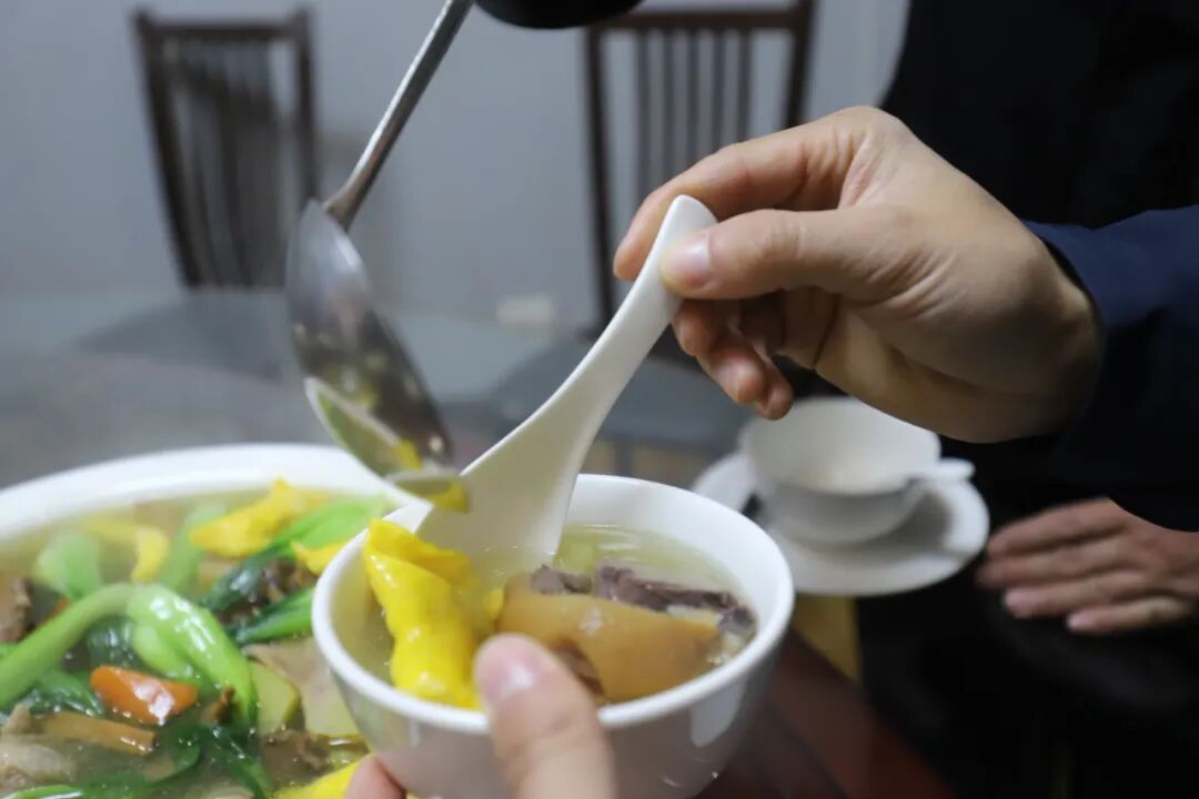烹飪竹溪蒸盆的過程,是一場耐心與技藝的考驗,當鍋蓋揭開的那一刻,熱氣騰騰,香氣撲鼻,令人垂涎欲滴。外圍金黃的雞蛋盒子,宛如一片片花瓣,翠綠的菜葉、鮮紅的枸杞,鑲嵌其間,色彩分明。挑開表面,紅的胡蘿卜、黃的土豆,還有棕色的香菇、深紅的臘肉,宛如一幅色彩繽紛的畫,簡直是為客人精心準備的藝術品,讓人舍不得吃掉這幅來自深山好物和完美匠心的“佳作” 。十余種食材匯聚一盆,煙火氣在豐收和團圓中升騰,色彩豐富的蒸盆仿佛將竹溪清澈的溪流、茂密的山林、肥沃的田野都融在一起,湯清、味醇、色鮮,這是大自然這個天然食材庫精心準備的盛宴。