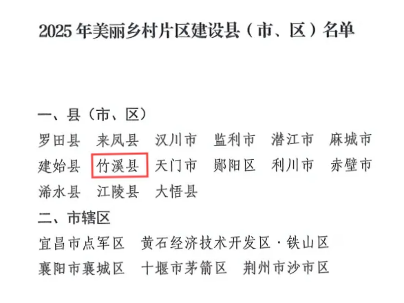 日前,湖北省財政廳公布2025年美麗鄉村片區建設縣(市、區)名單,全省共20個縣(市、區)入選,竹溪縣榜上有名。
