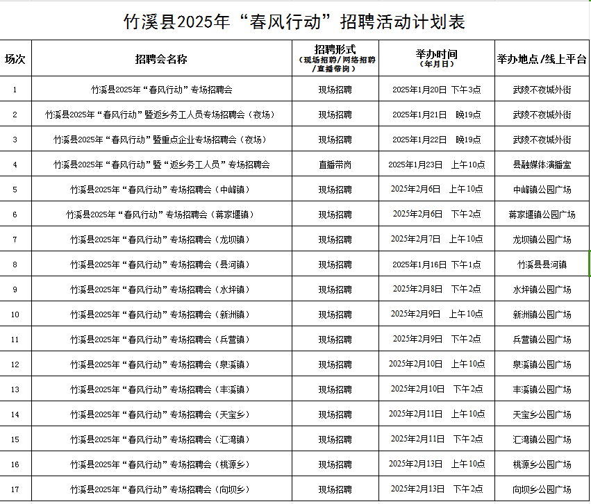竹溪縣2025年“春風(fēng)行動(dòng)”暨返鄉(xiāng)務(wù)工人員專場(chǎng)招聘活動(dòng)安排表
