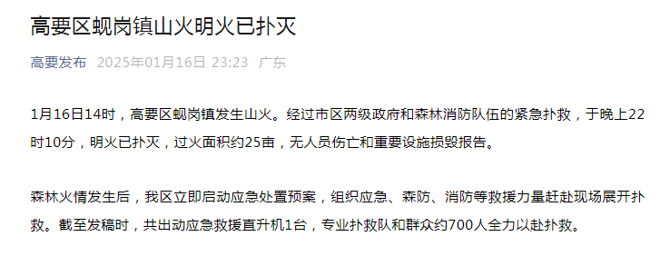 1月16日14時,廣東省肇慶市高要區蜆崗鎮廣東肇慶航空職業學院附近發生山火。山火發生后,當地組織應急、森防、消防等救援力量趕赴現場展開撲救,共出動應急救援直升機1臺,專業撲救隊和群眾約700人全力以赴撲救。明火已于16日22時10分撲滅,過火面積約25畝,無人員傷亡和重要設施損毀報告。