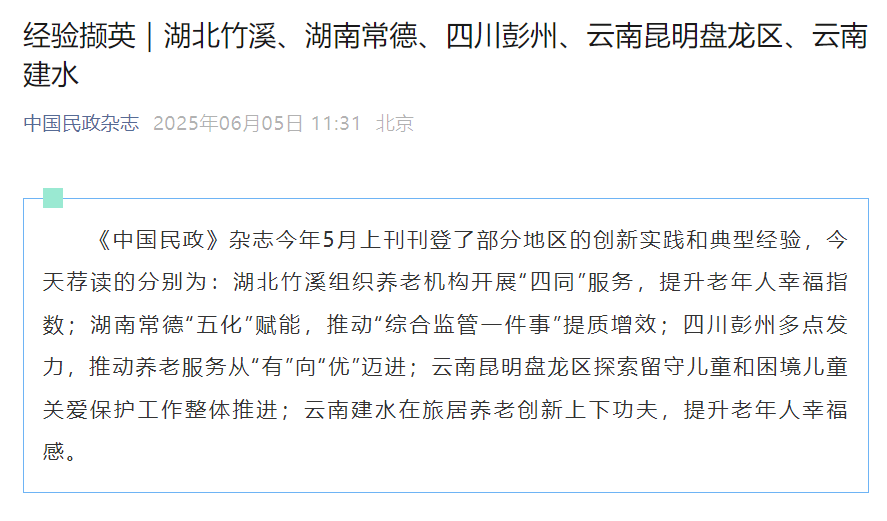 日前,民政部刊物《中國民政》雜志刊發《湖北竹溪:組織養老機構開展“四同”服務提升老年人幸福指數》文章宣傳推廣竹溪養老服務創新實踐和典型經驗。
