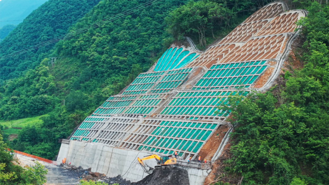 拌合站建成初始,設(shè)計(jì)七級沉淀池凈化污水,噪聲敏感點(diǎn)設(shè)置數(shù)字化監(jiān)控設(shè)施,拌合站料倉棚內(nèi)加裝自動噴淋降塵設(shè)施;裸露邊坡采取綠網(wǎng)遮蓋措施降低揚(yáng)塵,表土集中存放備用減少水土流失……經(jīng)過精心策劃和周密安排,這套“組合拳”讓施工與生態(tài)和諧共生,逐步形成了“綠色、環(huán)保、可持續(xù)”的環(huán)水保新格局。