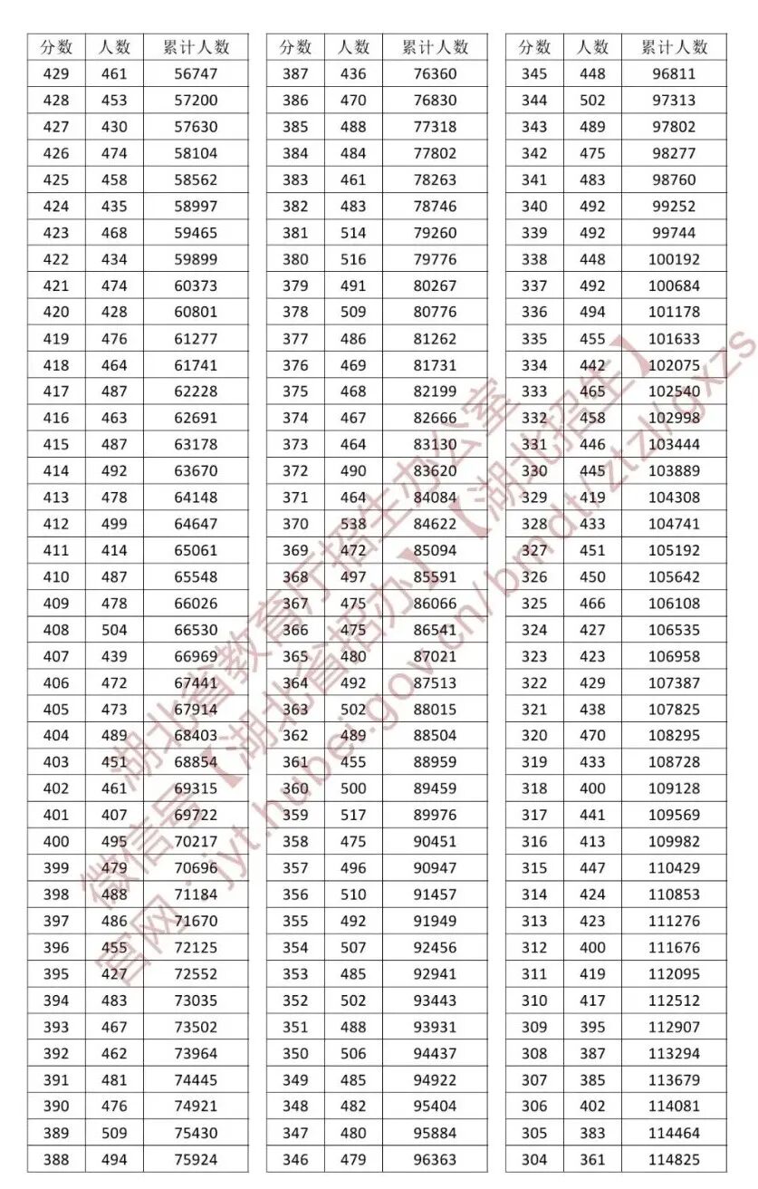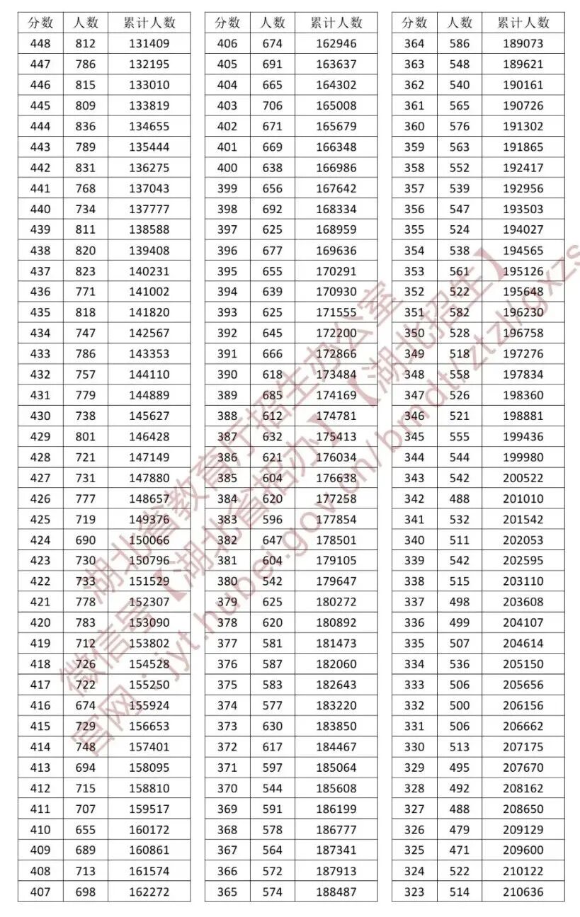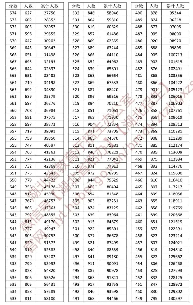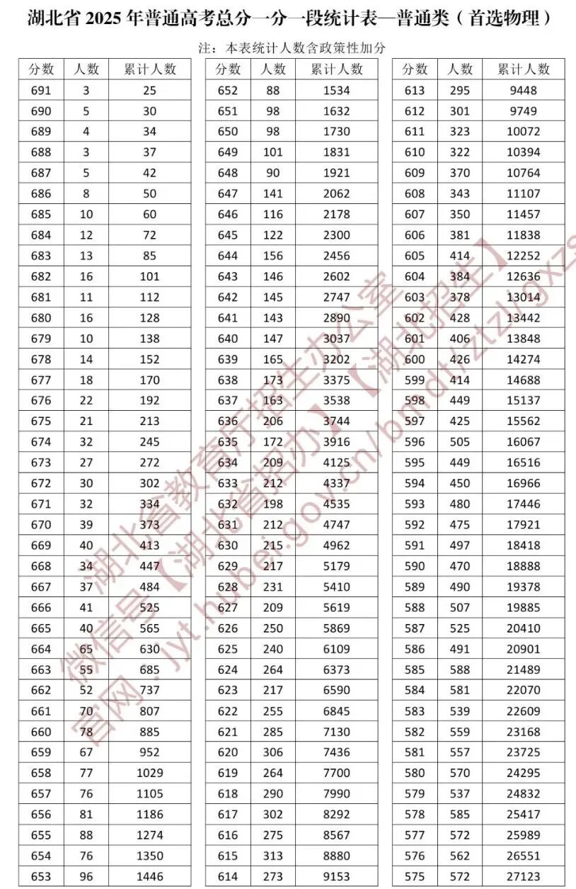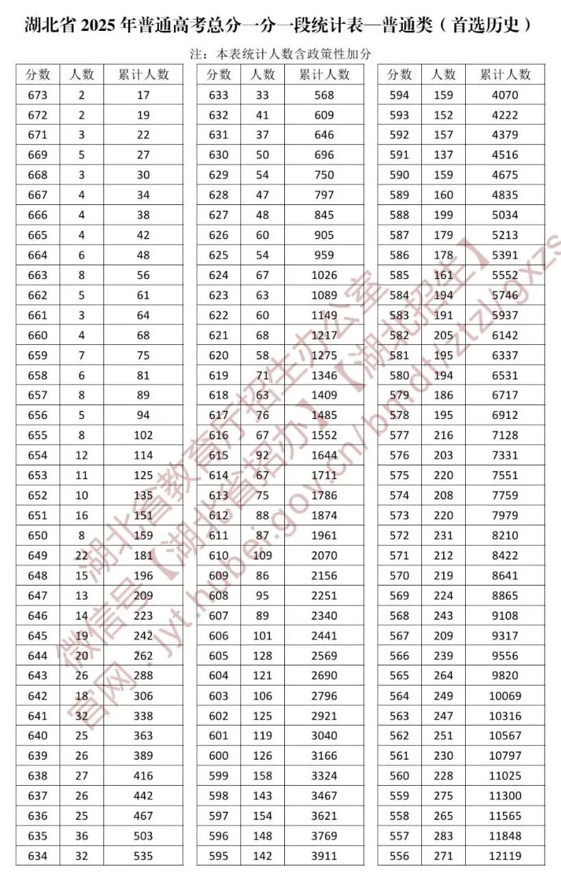 剛剛,湖北省教育廳發(fā)布2025年湖北高考普通高校招生錄取控制分?jǐn)?shù)線,2025年普通高考總分一分一段統(tǒng)計(jì)表。