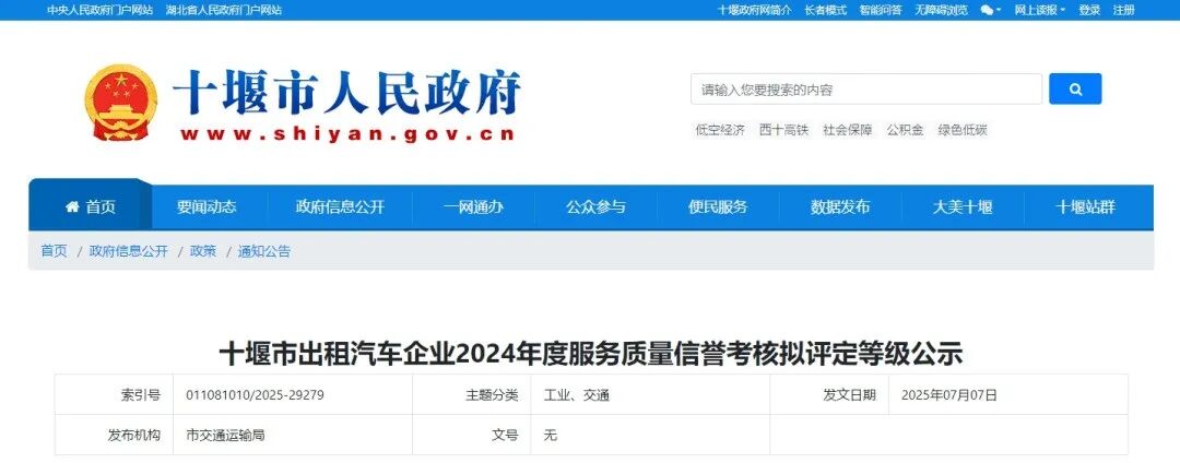 近日,十堰市交通運輸局在十堰政府網發布十堰市出租汽車企業2024年度服務質量信譽考核擬評定等級公示。十堰竹溪亨運集團出租車有限公司擬評定為“AAA”級企業,詳情如下: