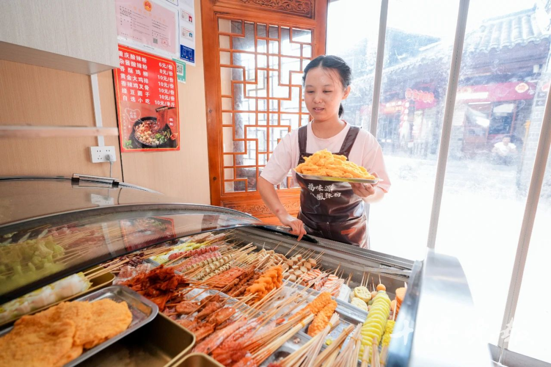 8月1日下午3點,記者跟隨梁冰冰來到竹溪縣城一家串串店,這是她打工的地方。梁冰冰系上圍裙,熟練地挪開擠在一起的冰柜和桌椅。