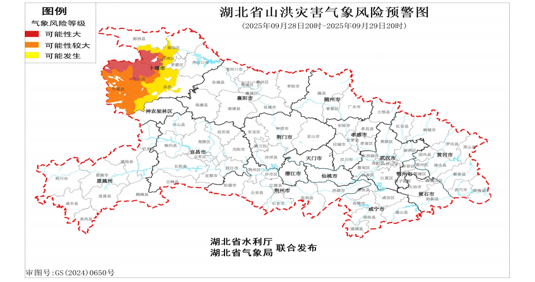 湖北省水利廳和湖北省氣象局2025年9月28日20時聯合發布紅色山洪災害氣象預警。預計2025年9月28日20時至9月29日20時,下列地區存在山洪災害風險:
