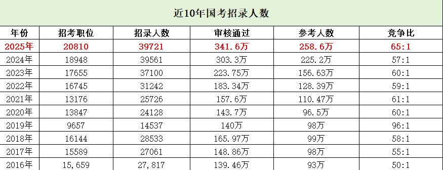 【核心發(fā)現(xiàn)】五年分?jǐn)?shù)線“躺平”,你的對手卻在“狂奔”華圖教育教研團隊數(shù)據(jù)顯示,20021至2025年,國考筆試合格分?jǐn)?shù)線驚人一致:省級以上(含副省級)職位:105/60分市(地)、縣(區(qū))級職位:95/50分特殊類別職位:90/45分千萬不要被這“穩(wěn)定”的分?jǐn)?shù)線迷惑!【數(shù)據(jù)解讀】備考窗口前移,已成上岸關(guān)鍵縱觀近10年招錄情況(如下表),盡管招錄名額有所增加,但報名大軍增幅更猛,“僧多粥少”的局面從未改變。