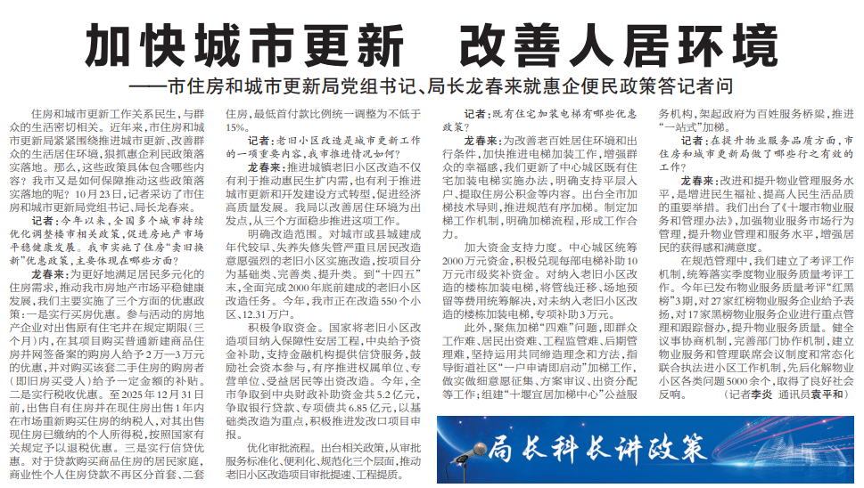 為落實黨中央重大決策部署和省委、市委工作要求,推動“兩重”“兩新”工作走深走實,助力全市經濟社會高質量發展,近日,十堰日報推出“局長科長講政策”專欄,進一步拓寬政策宣傳渠道,提升政策知曉率和覆蓋面。日前,十堰日報采訪了市住房和城市更新局黨組書記、局長龍春來。