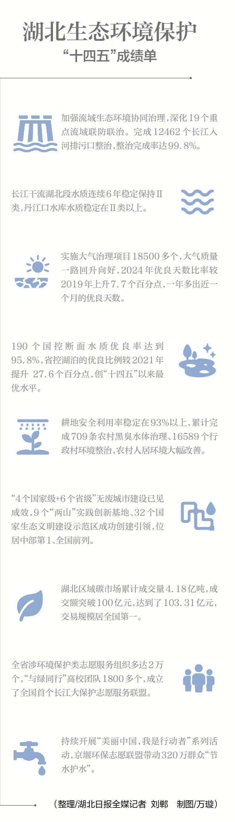 9月11日,在湖北省政府新聞辦舉行的“決勝收官‘十四五’謀篇布局‘十五五’”系列新聞發布會上,湖北省生態環境廳黨組書記、廳長嚴天文介紹,“十四五”以來,湖北始終堅持生態優先、綠色發展,生態環境質量持續改善,在國家2024年污染防治攻堅戰成效考核中,我省斬獲優秀等次。美麗湖北發展“含綠量”越來越足,支點的生態承載力不斷提升。